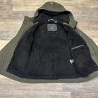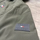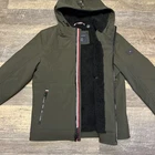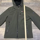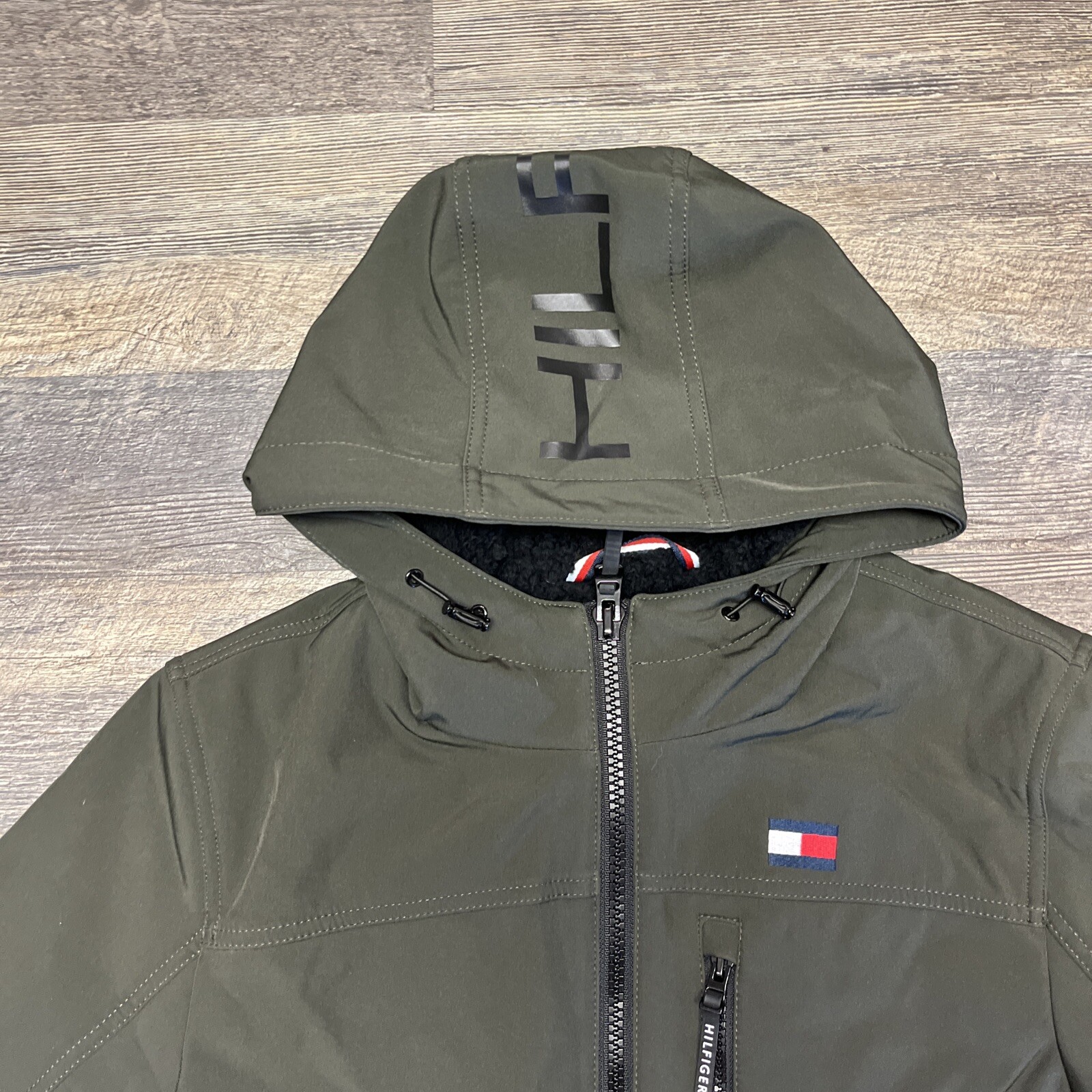 Elevate your winter wardrobe with this Tommy Hilfiger Men's Hooded Sherpa Lined Performance Jacket in OLIVE. The jacket features a softshell fabric type with a mid-length jacket/coat style, perfect for outdoor activities such as walking, cycling, skiing, and hiking. It is also wind-resistant and water-resistant, making it a reliable choice for any weather conditions. The jacket includes several features such as zipped pockets, button closure, and a hood. The sherpa lining material is made of polyester and the insulation material is also made of polyester. The jacket is machine washable and is a regular fit, suitable for men of size S. It is designed with a solid pattern and accents of a zipper, embroidered logo, and a full zip. This designer jacket is perfect for any occasion, whether it be for travel or casual wear.
