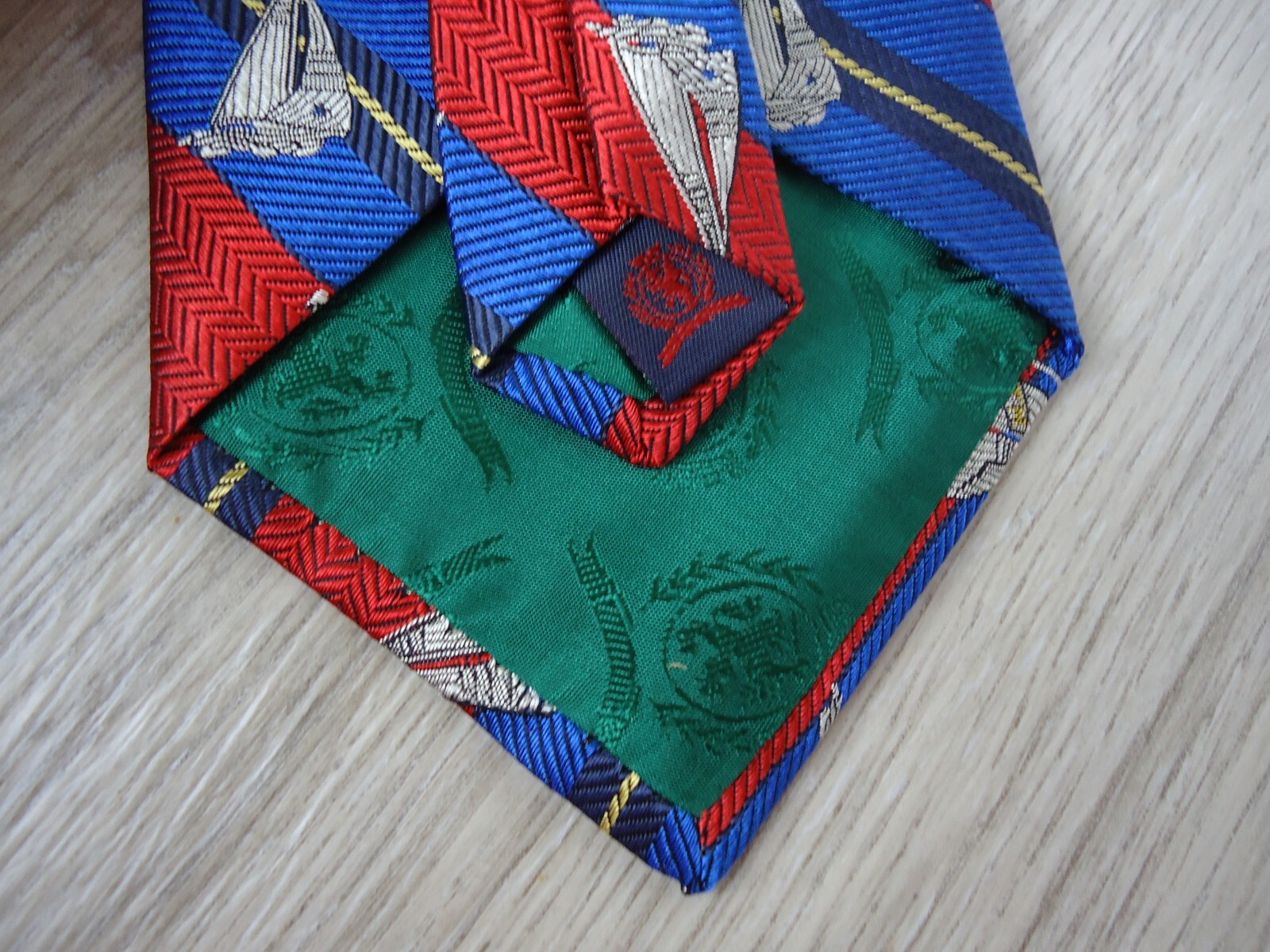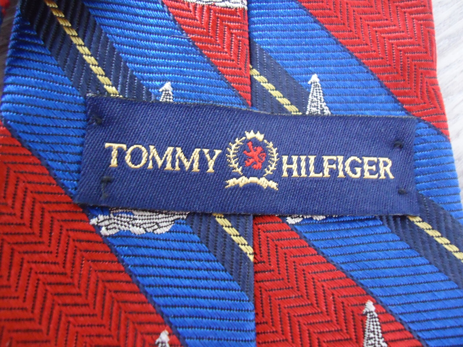 Tommy Hilfiger Men Tie VTG Silk Striped Sailboats Red Navy Gold Classic Nautical. 55 inch long. Pictures shown it folded in half for length. J3