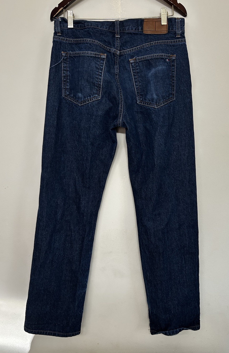 The product is a pair of Tommy Hilfiger men's jeans in size 32x32 with a relaxed fit. The jeans feature a solid dark wash, blue color, and are made of cotton denim fabric. They have a zip and button closure, 5-pocket design, and are machine washable. The style is a straight leg with a mid-rise, making them suitable for all seasons. Perfect for a 90s-inspired look, these jeans offer comfort and easy care with a touch of small wear on the back pockets.
