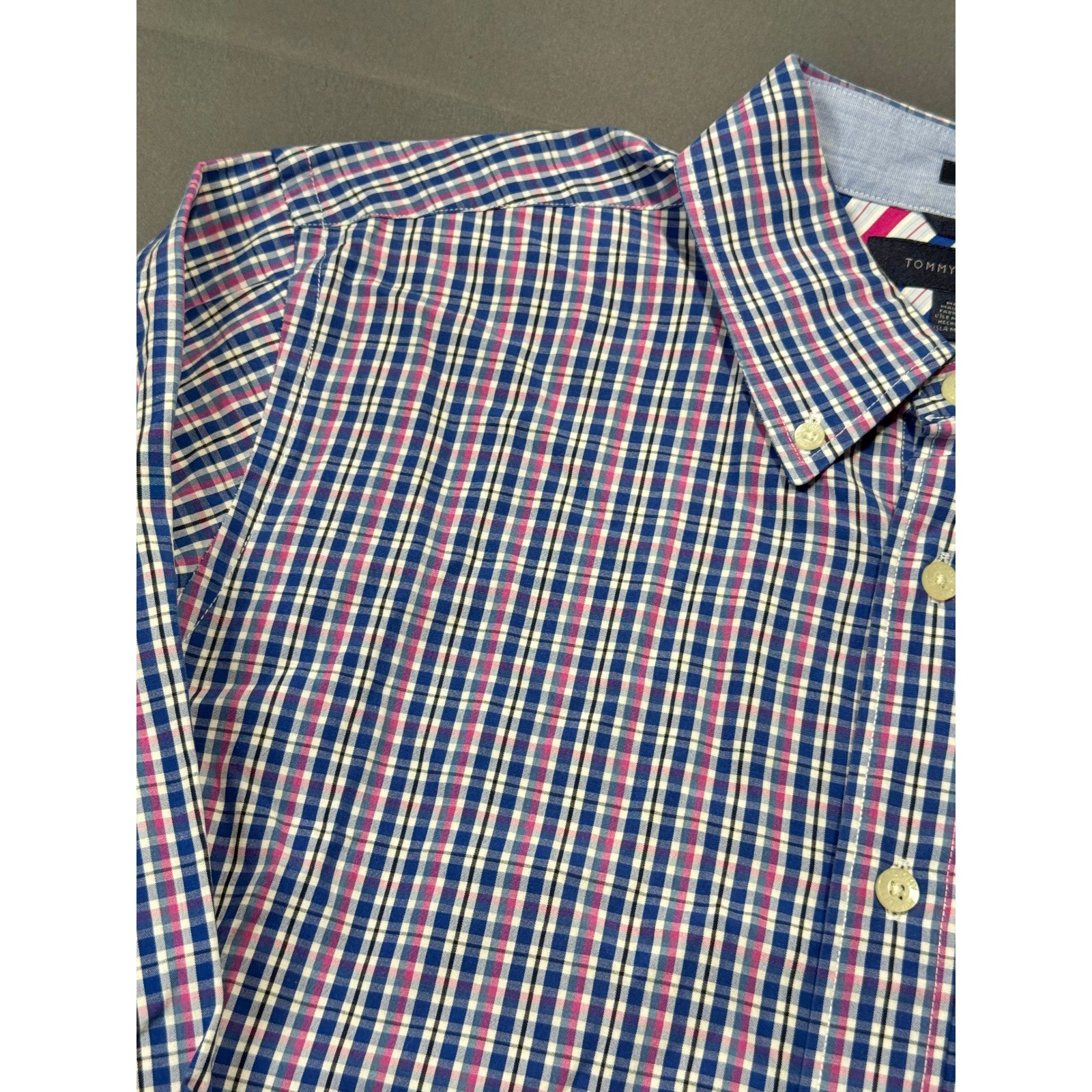 Tommy Hilfiger men's slim fit long sleeve button down shirt. Classic plaid pattern in shades of navy blue pink and white. Features a button-down collar and single-button cuffs. Measurements: • Chest: Pit to pit: 22 in • Length: 30 in Sleeve Length: Long Sleeve Department: Men Fabric Type: Woven Closure: Button Accents: Button Pattern: Plaid Theme: Preppy Material: Cotton Fit: Slim Features: Pockets Collar Style: Button-Down Type: Button-Up Neckline: Collared Occasion: Casual Season: Spring, Fall Chest Size: 42 in Country of Origin: Mauritius Keywords: Tommy Hilfiger, mens shirt, slim fit, button down, plaid, long sleeve, casual, business casual, checked, button collar, button cuff, designer shirt Please refer to Photos This item is preowned very good condition, please refer to the measurements for more accurate sizing of the item. Fast Shipping 100% authenticity guaranteed