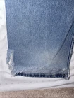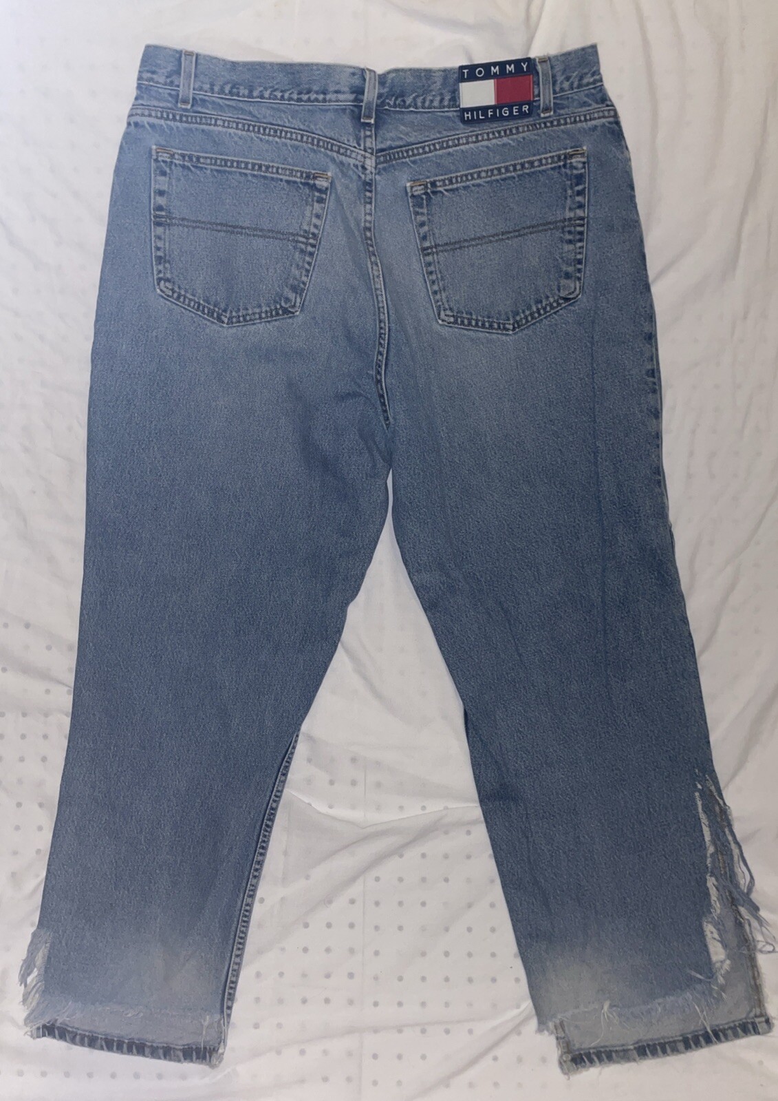 Torn back legs skater style This is a pair of Tommy Hilfiger Men's Freedom Jeans in a vintage 90s style, featuring a relaxed fit and made with 100% cotton denim material. The jeans have a waist size of 32 inches and a bottoms size of 36, with a zip closure and medium fabric wash. They are designed with accents like buttons, zippers, and the Tommy Jeans logo, embodying a casual and comfortable look. These classic blue jeans also boast a 30-inch inseam and are part of the Tommy Jeans product line, made in the United States.