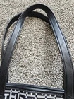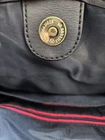 This Tommy Hilfiger Tote bag features a classic navy, blue, and white color scheme with gold accents, making it a stylish accessory for women. The bag has a rectangular shape with a snap closure and a navy faux leather handle drop of 9 inches. The exterior is made of faux leather with nylon lining, and it includes inner and outer pockets for added functionality. With the Tommy Hilfiger logo pattern and a spacious size, this tote is both fashionable and practical for everyday use.