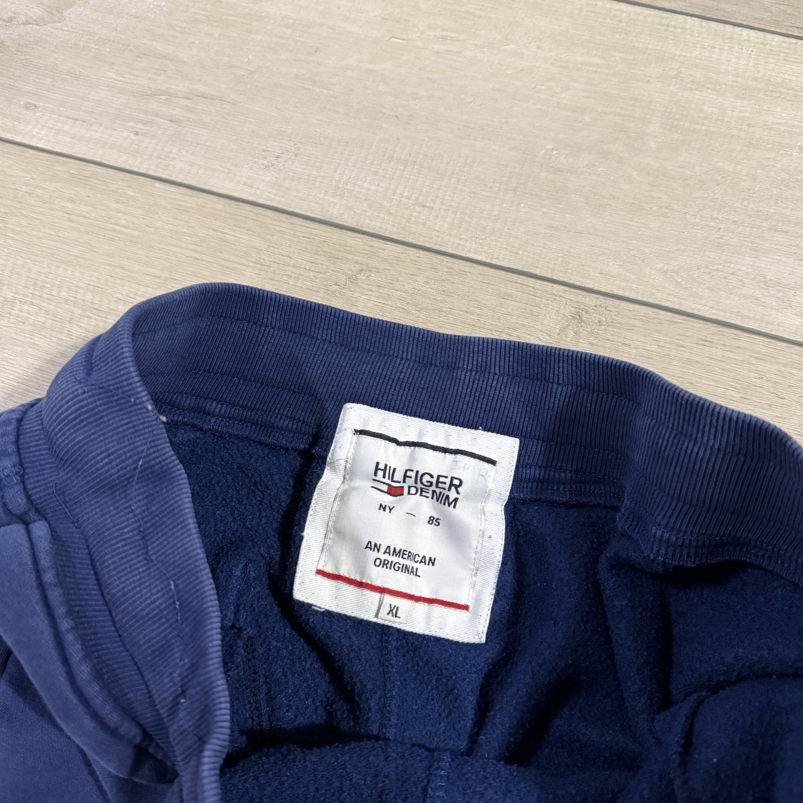 Size: Youth XL; fit adult S/M; Waist approx 30-32'; Inseam 27' Color: Navy Material: Cotton blend (soft fleece lining) Features: Embroidered Tommy Hilfiger logo, drawstring waist, ribbed cuffs, side pockets Condition: Good pre-owned condition with no major flaws Hashtags: #tommyhilfiger #hilfigerdenim #sweatpants #streetwearstyle #90srevival
