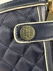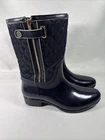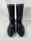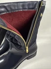 Tommy Hilfiger TWFREEZ Mid Calf Navy Quilted Top/Rubber Bottom & Sole, Maroon Lined, Gold Side Zip Rain Boots Sz 8. Pre-owned, please see photos for condition.