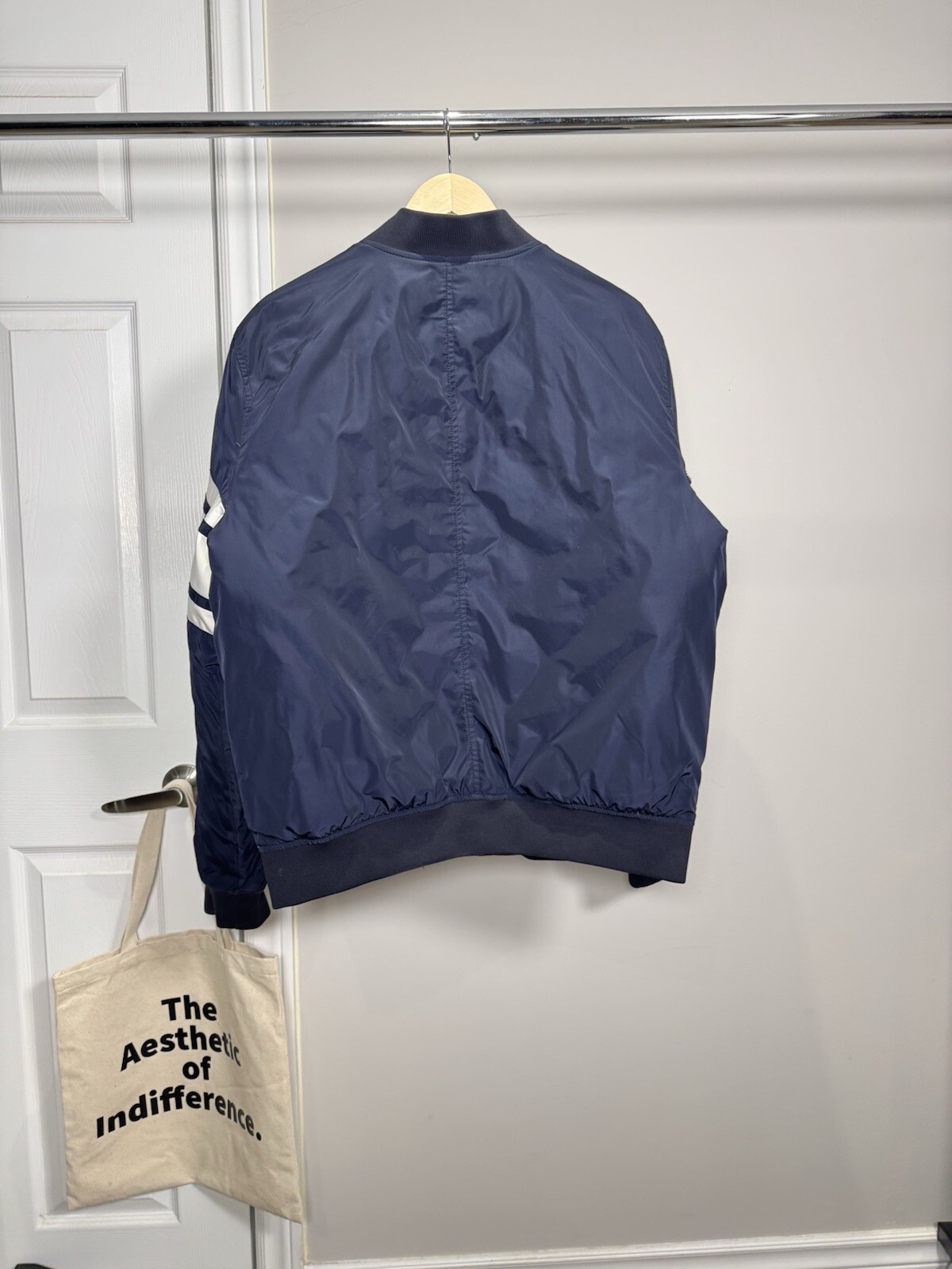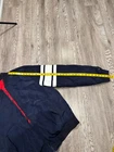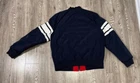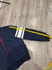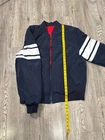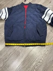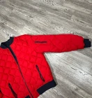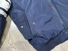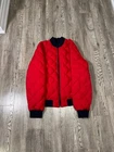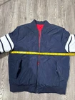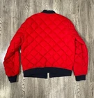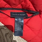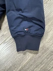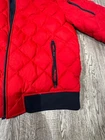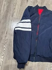 Stay warm and stylish in this Tommy Hilfiger Bomber Down Jacket for men in size XL. The jacket features a reversible design with a navy outer shell and a red diamond quilted pattern, providing versatility in your wardrobe. Made with high-quality polyester and insulated with down feathers, this jacket ensures both comfort and durability. Perfect for casual outings or outdoor adventures, this bomber jacket is a must-have addition to any men's wardrobe. Measurements shown in photos. Jacket is missing zipper Please contact if you have any questions
