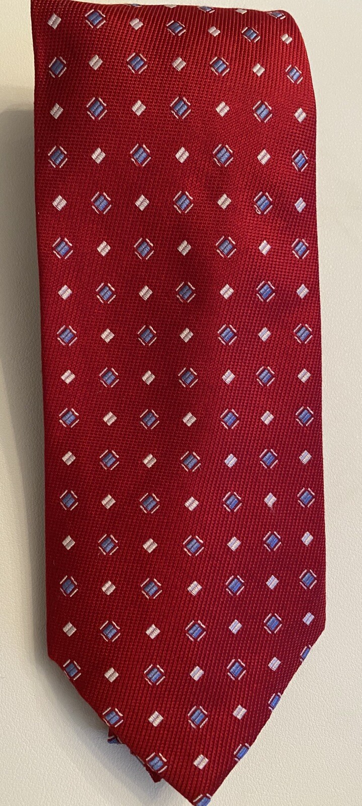 Tommy Hilfiger 100% Silk Designer Neck Tie Red, Blue Square Geometric Patriotic. Condition is Pre-owned. Shipped with USPS Ground Advantage.