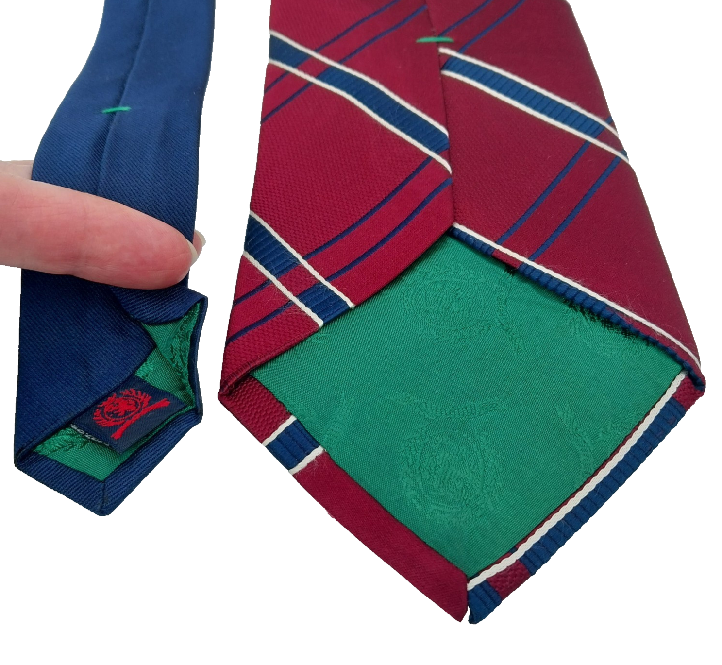 This is a Tommy Hilfiger necktie made in the USA from 100% silk. It features a classic striped pattern in dark red, white, and blue. The tie is 60" long and 3 1/2" wide at the tip. Preowned in good condition.