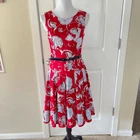 Tommy Hilfiger Belted Sleeveless A-line Dress Scarlet Red and Blue size 6 Approximate measurements while lying flat are Pit to pit: 16” Shoulder to hem: 38” Waist: 13.5” Material: 97% cotton, 3% elastane Very figure flattering cinching in at the waist.