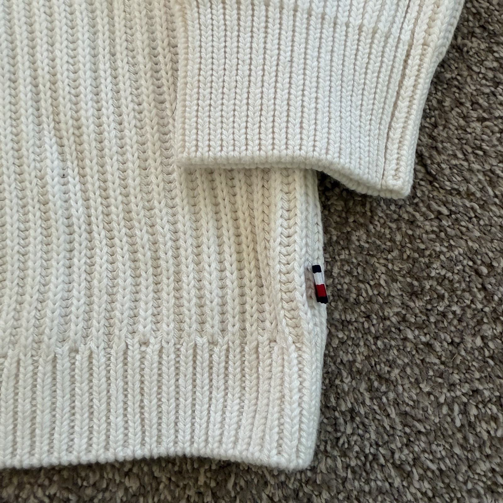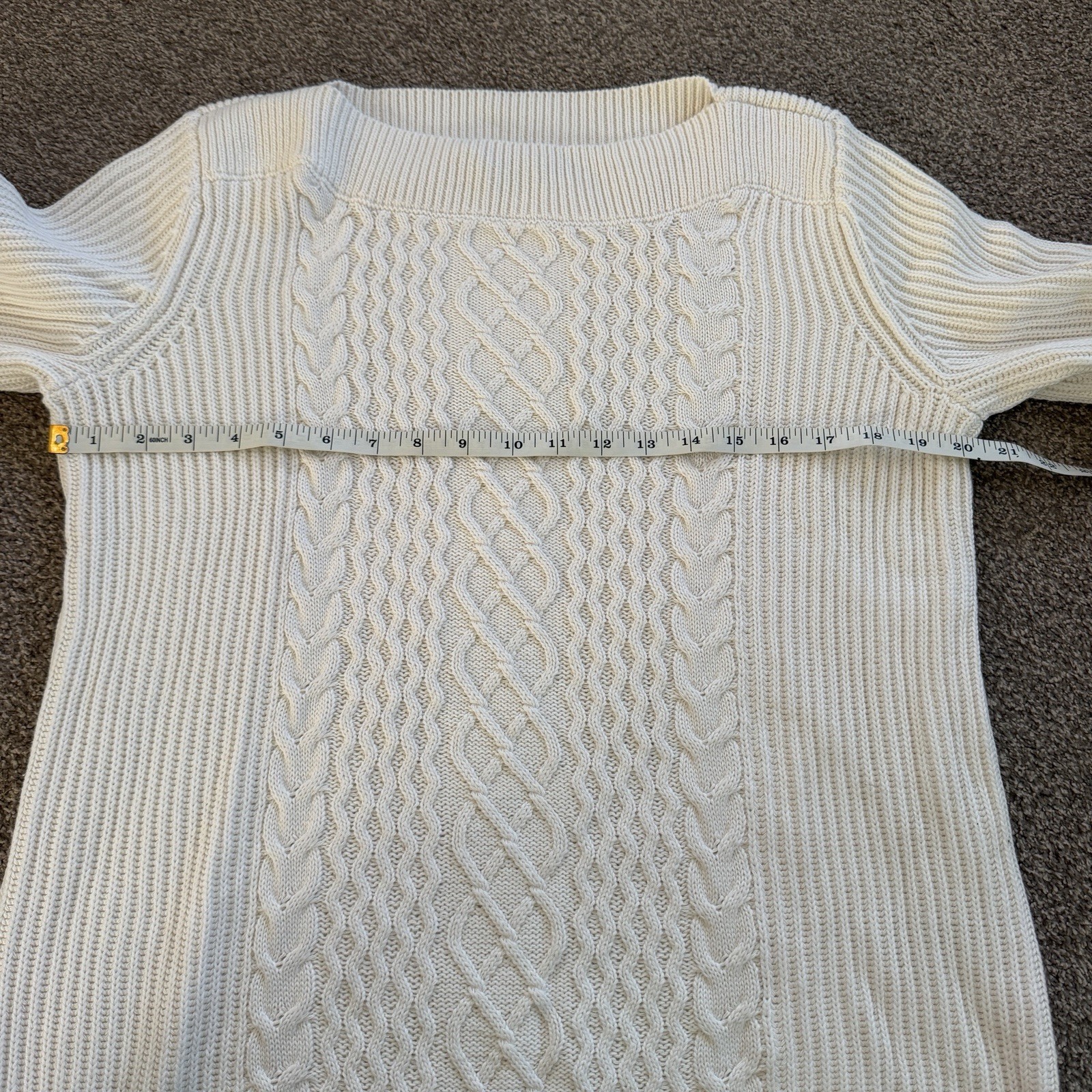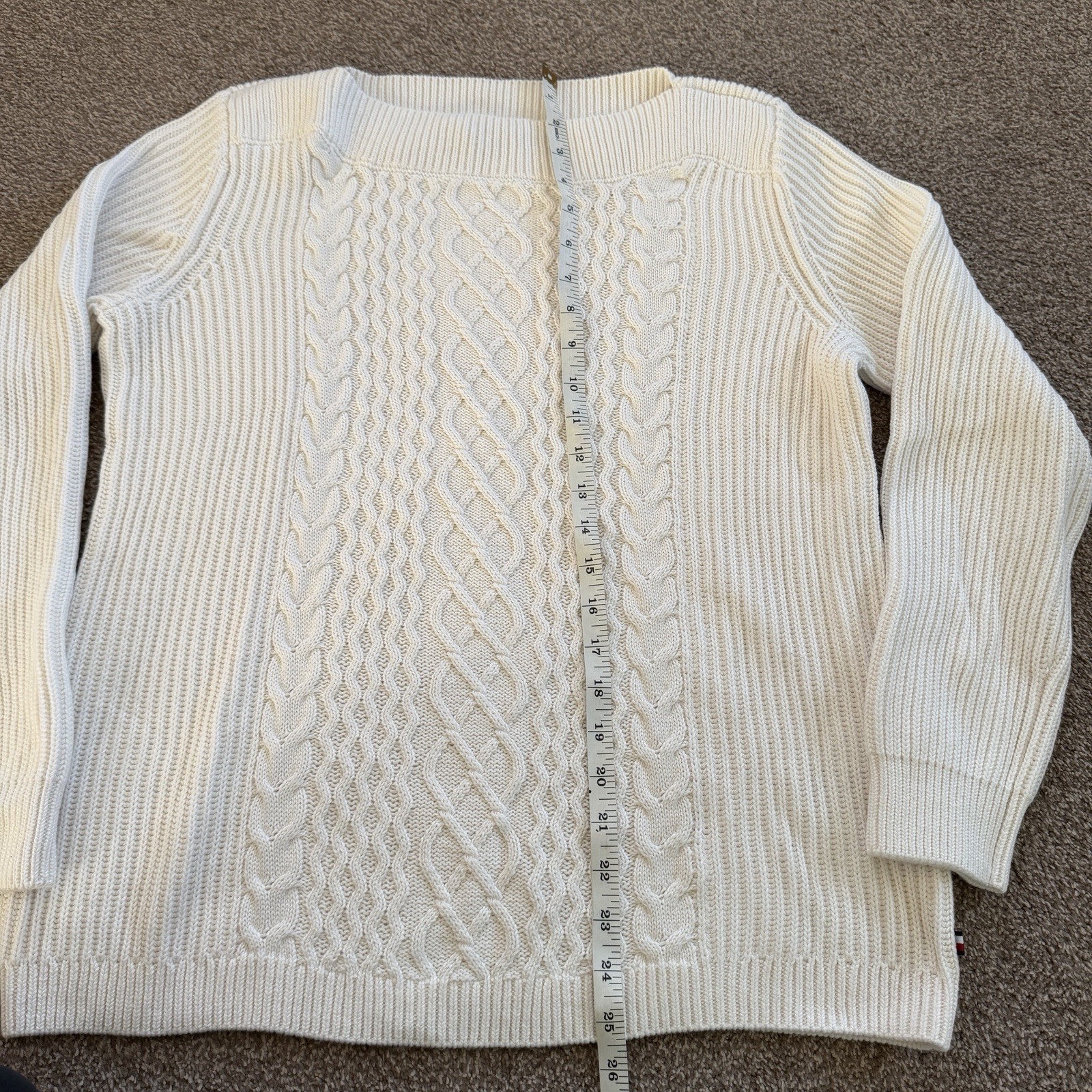 Excellent condition women’s medium Tommy Hilfiger boat neck cable knit sweater in cream. Pullover style. See pics for measurements. 60% cotton, 40% acrylic and machine washable.