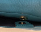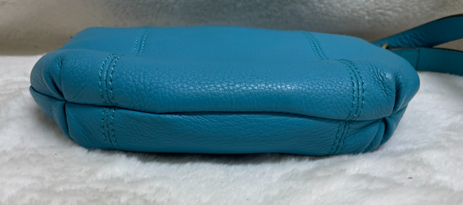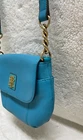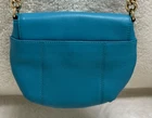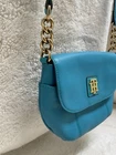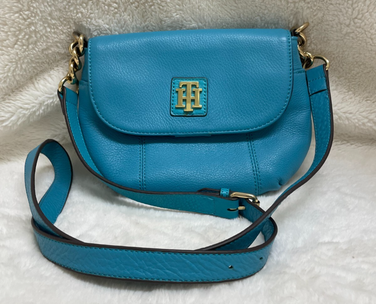 This is a gorgeous, teal colored adjustable, shoulder strap handbag by Tommy Hilfiger. The gold hardware accents the teal color very nicely. Flap, with zap closure. Outside, snap, pouch for cell phone, keys...inside has side zip pocket, and other side has 2 small pouches. Inside fabric is signature Tommy Hilfiger navy blue, with red stripe. You will want to add this bag to your collection.CONDITION: Preowned, excellent conditionMATERIAL: not sure, tag doesn't say, looks like pebble leather faux?SIZE: Small, 9" width, 7" height, 1" depth. adjustable shoulder strap up to 23"