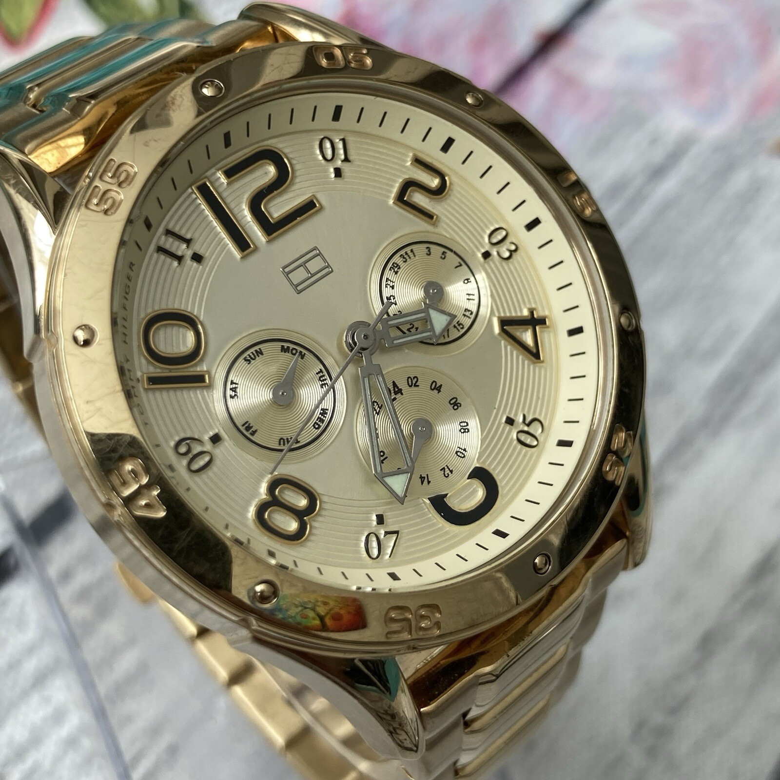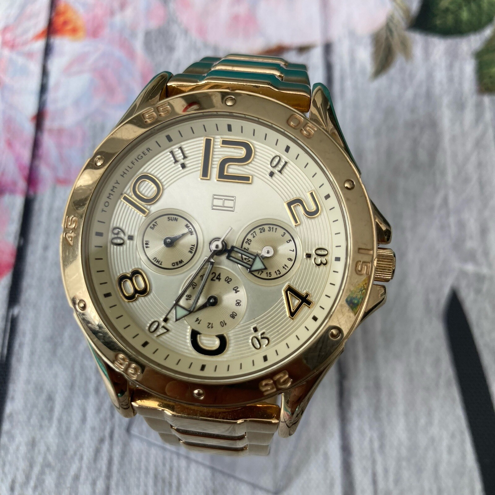 Tommy Hilfiger Watch unisex Designer Day Date 24h Champagne Dial Steel 40mm Case. A gorgeous designer timepiece featuring a stunning champagne multifunctional dial with day, date and 24h functions. The watch is in good pre-owned condition with some signs of wear to case and bracelet. The glass is in perfect condition. A fresh battery has been installed and is in perfect working order. The bracelet will fit a 7 inch wrist. The case measures approximately 40mm excluding the crown. No original box or papers. PLEASE NOTE DUE TO CUSTOMS, DELAYS AND LOST POST I DO NOT SHIP TO AFRICA, ITALY, SOUTH AMERICA, ISRAEL, PHILIPPINES OR ANY MIDDLE EASTERN COUNTRIES. PLEASE NOTE WE DO NOT GUARANTEE WATERPROOF ON ANY WATCH UNLESS STATED IN THE DESCRIPTION.