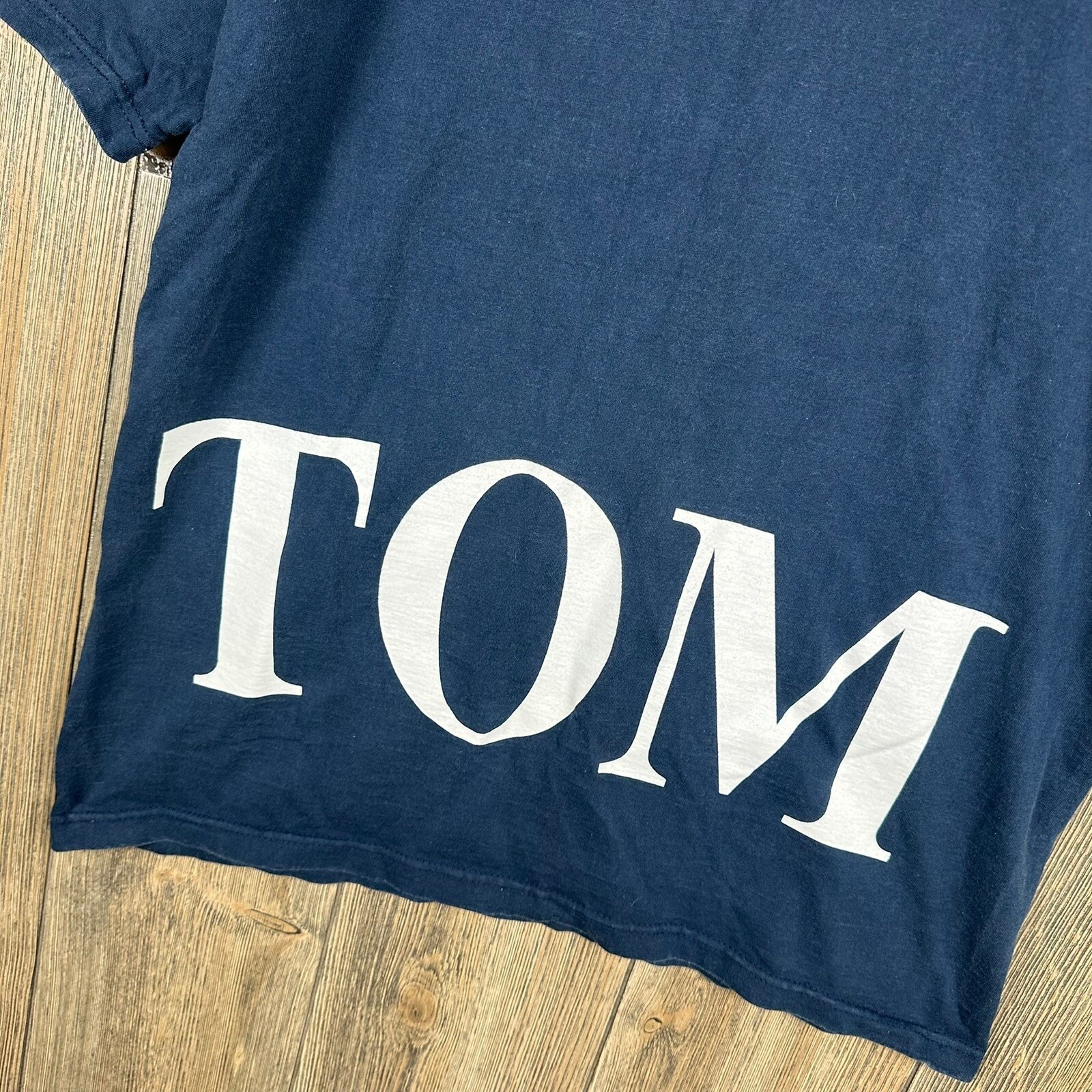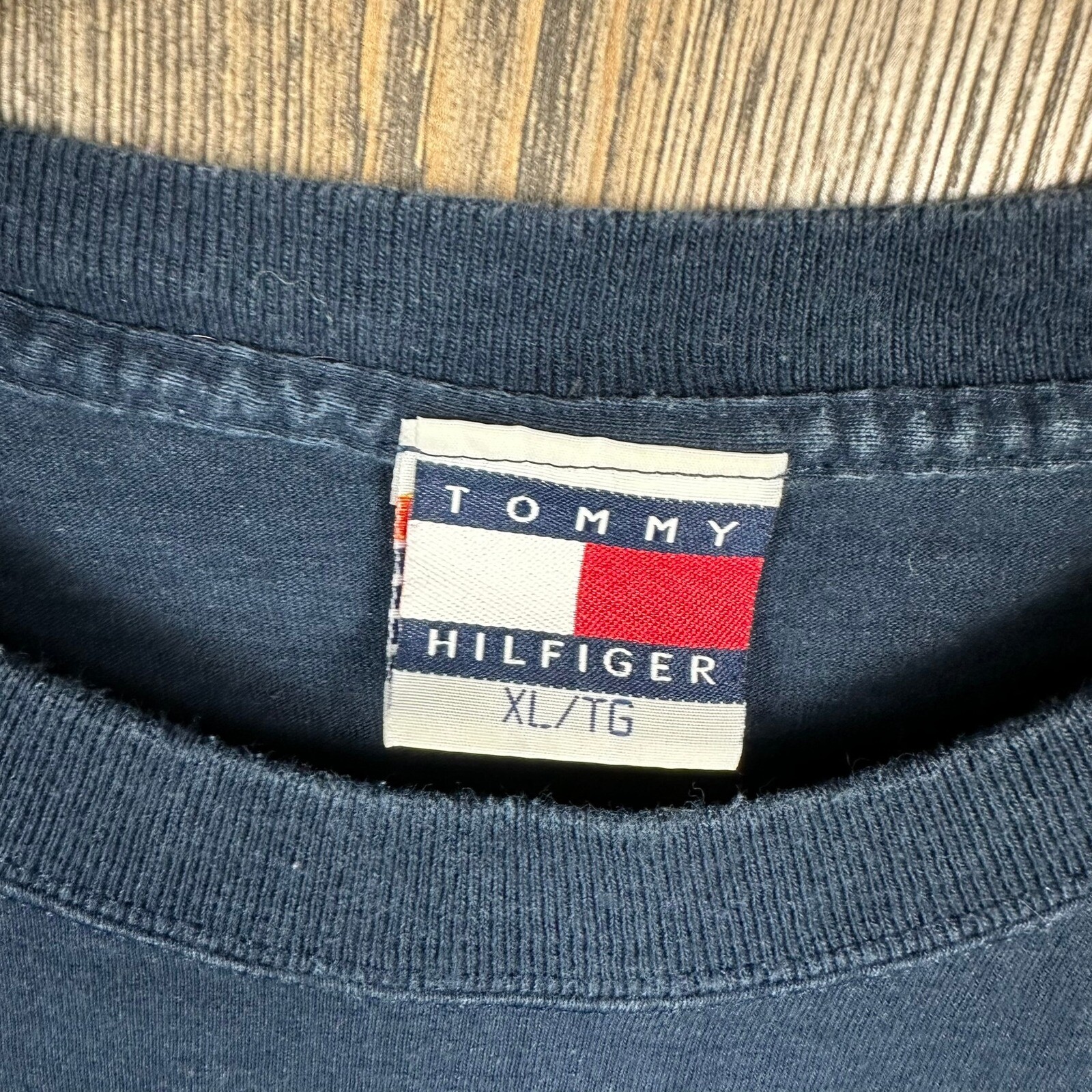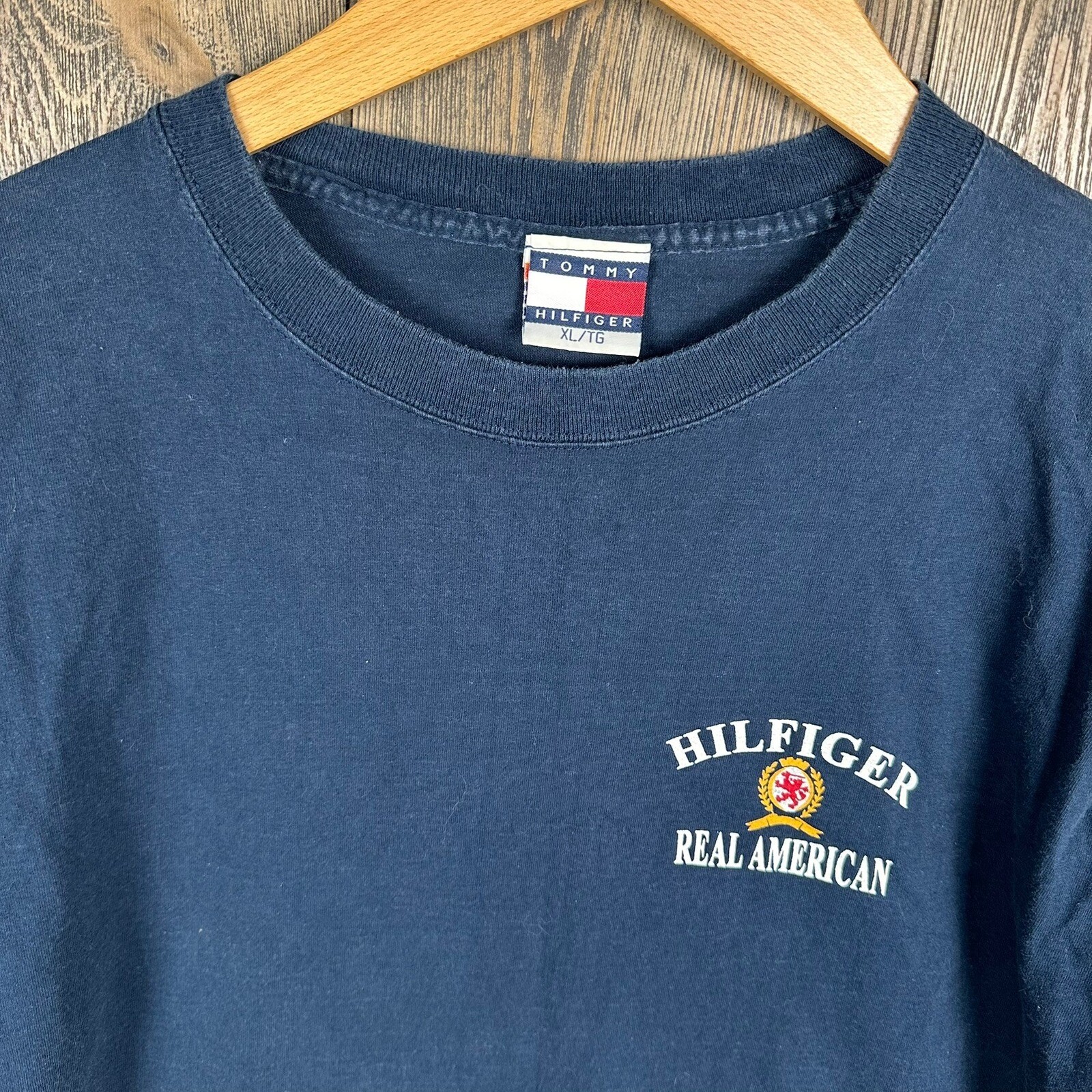 Tommy Hilfiger Real American Wraparound Spellout T-Shirt Vintage Size Large. Good used condition - a couple spots on the front seen in the last pic Size tag says XL but fits like a large - check measurements! Measurements: Pit to pit: 22" Top to bottom: 30" A vintage-inspired statement piece that exudes effortless cool. This Tommy Hilfiger t-shirt features a bold "TOMMY" graphic across the lower front, complemented by the iconic "HILFIGER REAL AMERICAN" emblem on the chest. The classic crew neck and short sleeves offer a comfortable, relaxed fit, perfect for everyday wear. The navy color provides a versatile backdrop for the striking white graphics, making it easy to pair with jeans, shorts, or chinos. Ideal for casual outings, weekend adventures, or adding a touch of retro flair to your everyday style.