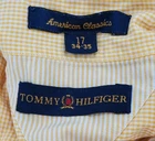 Tommy Hilfiger American Classics Button Down Shirt Yellow/ White Vintage Men's 17 34/35. It's yellow and white striped with a check pattern across the back of the shoulders. It's made of 100% cotton and there is a name and dry cleaning tag on the inside of the button flap. I took a picture of the front and back, so you can see the name isn't visible on the outside. Please check measurements as preowned item measurements may vary. The measurement across the chest laying flat is 27 1/2 inches, the length from the shoulder to the bottom is 30 inches, the measurement from the middle back of the neck to the shoulder seam is 11 1/2 inches and the length from the middle back of the neck to the end of the sleeve is 34 1/2 inches.