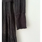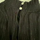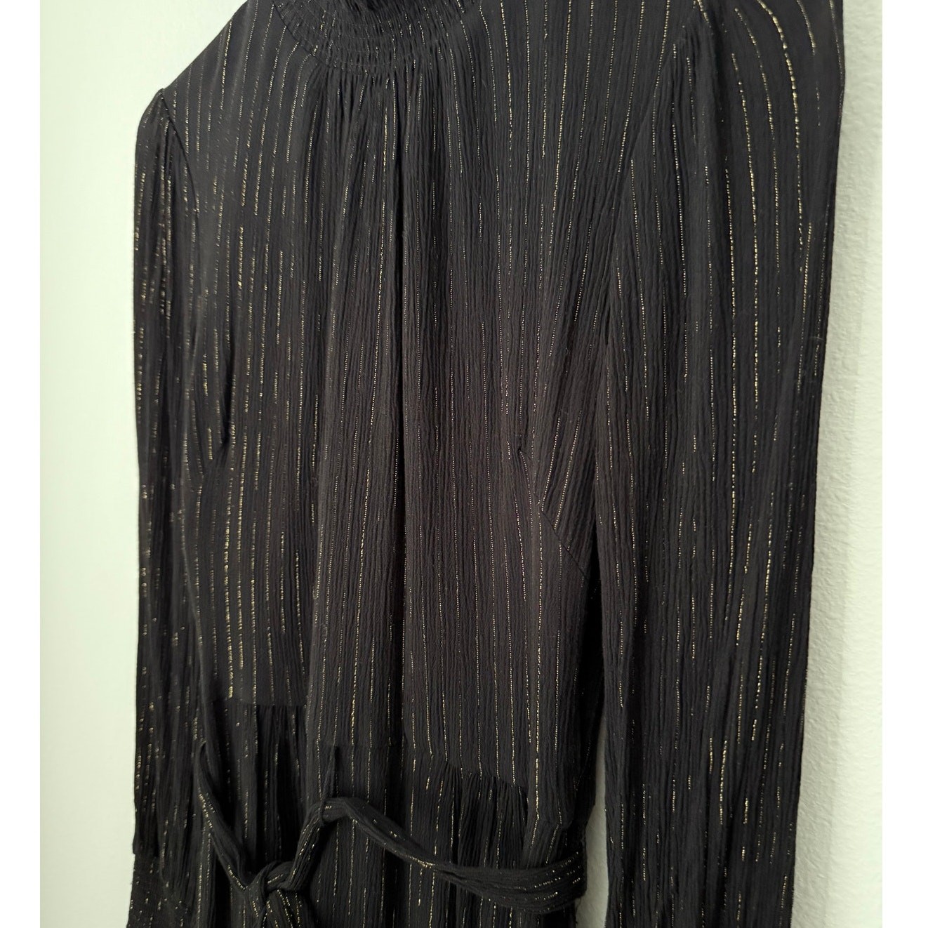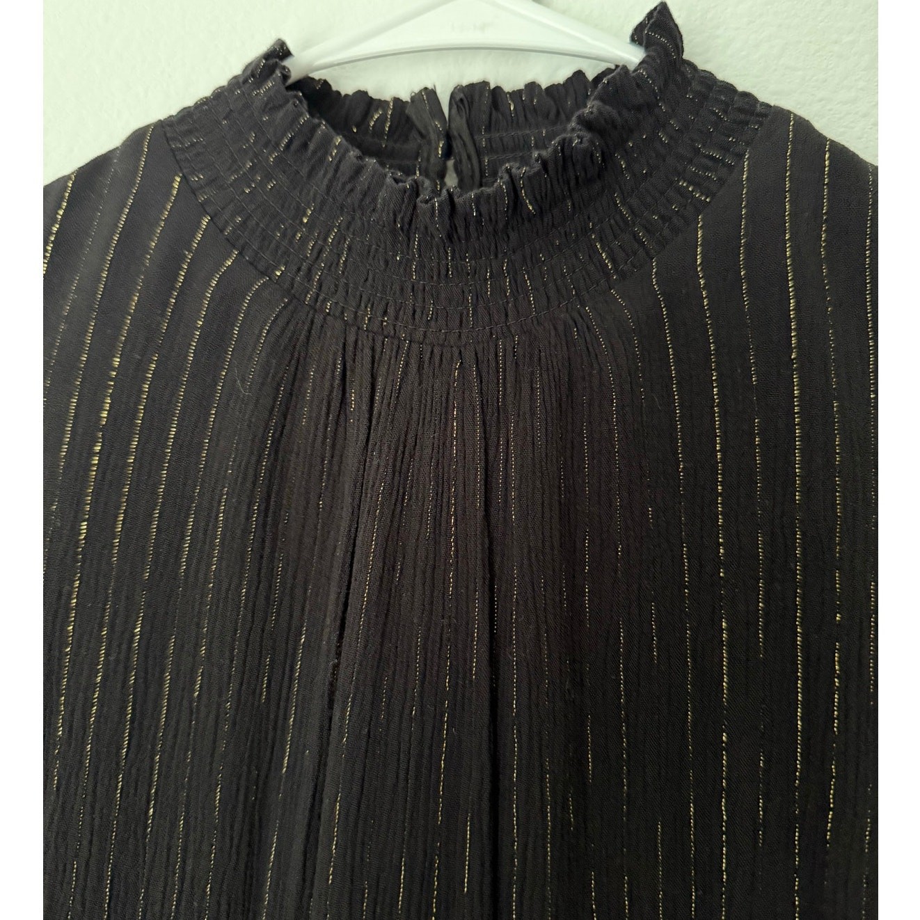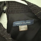 Tommy Hilfiger Women's Mini Dress long-sleeved mini dress with a subtle metallic vertical gold stripe pattern throughout. The dress features a high, ruffled neckline. The sleeves are long and finished with wide, smocked cuffs. The waist is cinched with a matching fabric tie belt, creating a flattering silhouette. The skirt portion of the dress is lightly flared with a ruffled hem. Lightweight fabric, ideal for both daytime and evening occasions. Size: 2 Viscose Excellent Condition - Only worn once Approximate Measurements: Total length: 36in Sleeve length: 24in