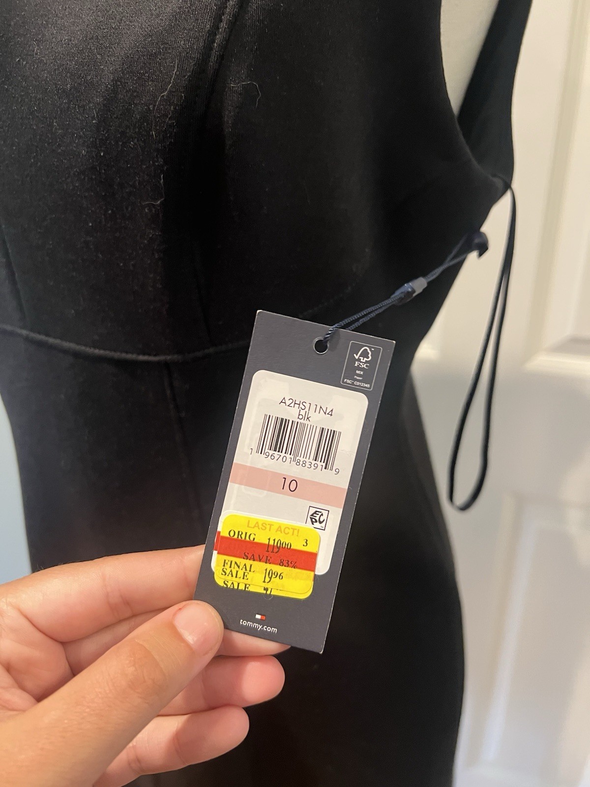 This Tommy Hilfiger women's dress in black, size 10, is a midi length sleeveless formal garment perfect for both casual and formal occasions. Made of polyester, this sheath style dress features a zip closure and is recommended for dry clean only. With a classic black color and suitable for summer, fall, and spring seasons, this dress embodies elegance and sophistication, making it a versatile addition to any woman's wardrobe.