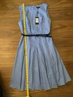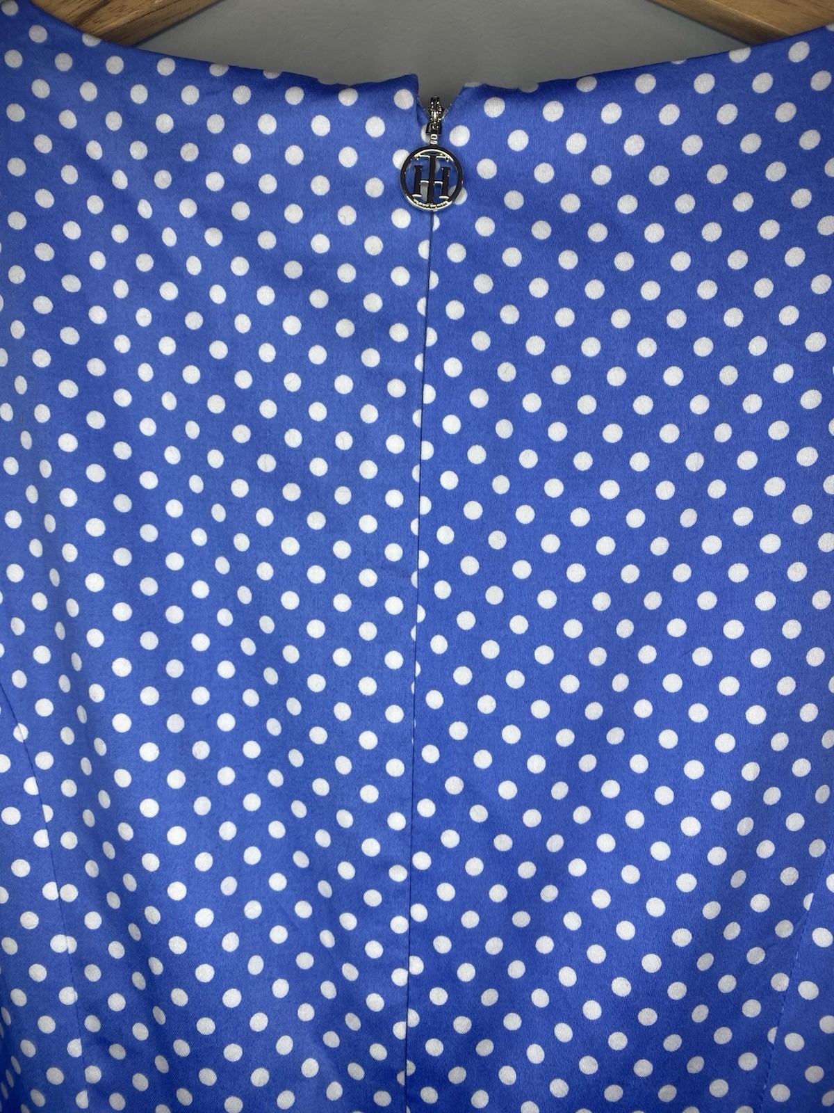 This Tommy Hilfiger Women's Blue Sky Polka Dot Dress in size 6 features a round neck, sleeveless design, and a knee-length hem. Made of satin polyester fabric, this A-line dress is ideal for parties, cocktails, or casual wear during the summer and spring seasons. The dress is accented with a zipper closure and is lined for added comfort. The classic polka dot pattern adds a touch of princess-like charm to the timeless design, making it a versatile and stylish addition to any wardrobe.