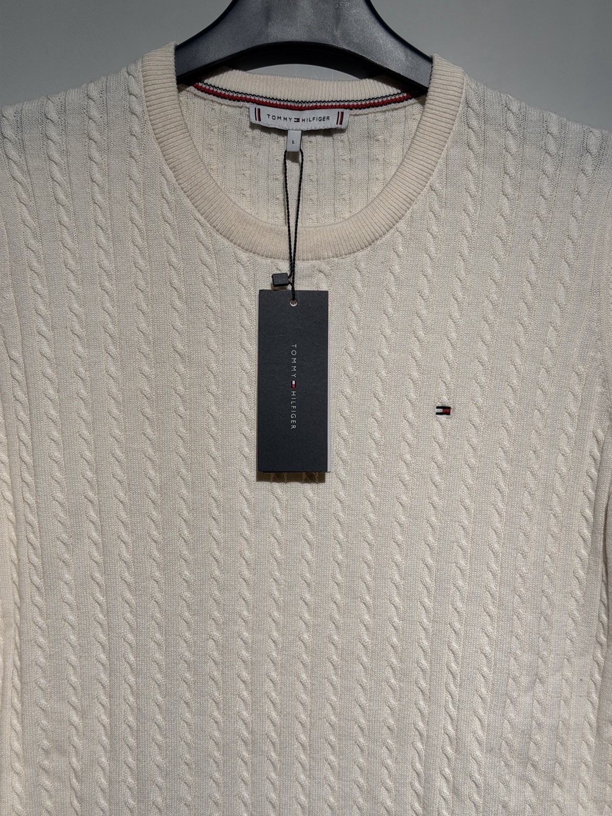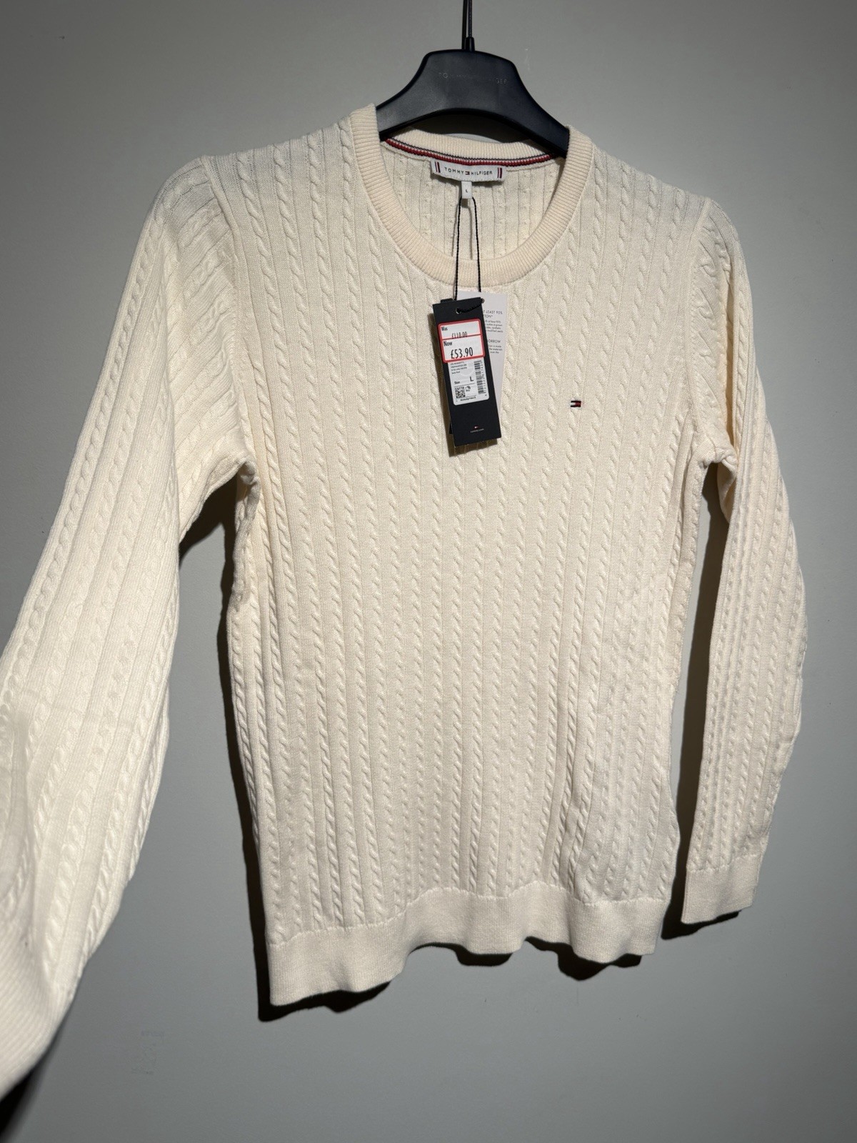 This Tommy Hilfiger Women's Ivory Cable Knit Jumper in size L is a stylish and versatile addition to any woman's wardrobe. Made from cotton with a crew neck and long sleeves, it is perfect for casual occasions during the winter and autumn seasons. The classic cable knit design and Tommy Hilfiger logo accent add a touch of sophistication to this pullover jumper, making it a timeless piece that can be machine washed for easy care.