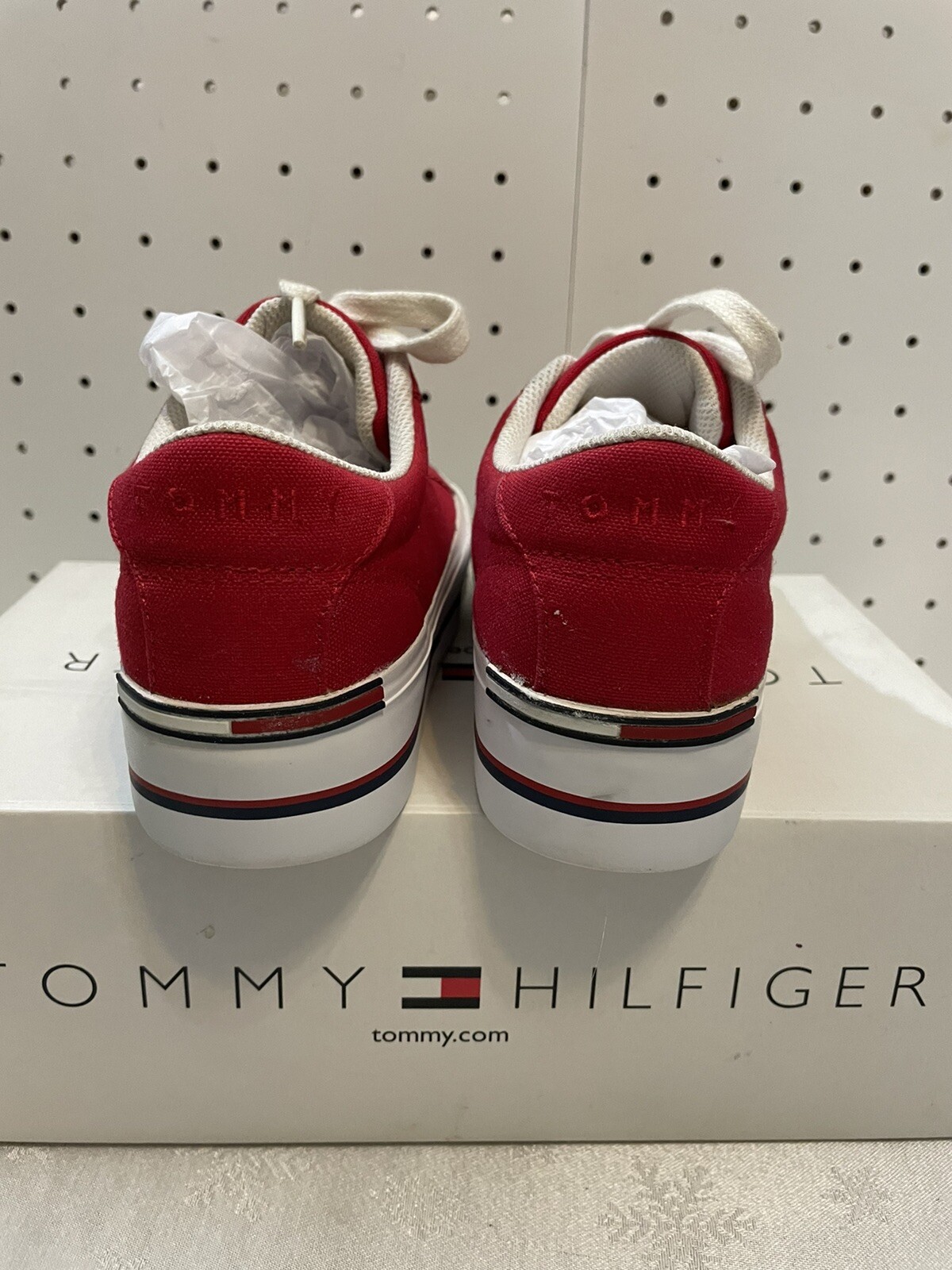 Step into classic style with these Tommy Hilfiger red canvas sneakers, perfect for women who value both comfort and timeless fashion. The sneakers feature a sleek lace-up closure, ensuring a secure fit for your active day ahead. With a versatile red hue, they effortlessly complement any casual or activewear ensemble, making them a must-have for any season. Crafted with breathable textile uppers and soft fabric lining, these shoes provide cushioned comfort for all-day wear. The durable rubber outsoles offer reliable traction for a variety of activities, from walking and tennis to a bustling school day. The iconic Tommy Hilfiger logo adds a touch of sophistication to these low-top sneakers, making them an essential addition to your footwear collection. Great condition- Smoke free home- Thanks for stopping in check out my online thrift stuff added daily much love Shelly J 💚