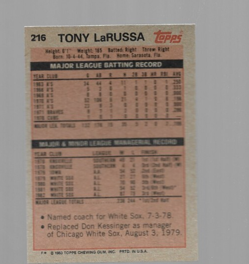 PDave Kingman 1983 Topps #160 New York MetsLEASE READ THROUGHOUT DESCRIPTION. Good day. No insurance. Please NO e-Checks, they take too much time to clear . FREE shipping to Canada and USA and $9 rest of the world. Tony LaRussa 1983 Topps #216 Manager Chicago White Sox Feel free to ask questions. NO LOCAL PICKUP . PAYPAL is of course the preferred method of payment. Thanks for looking and happy bidding