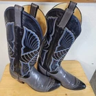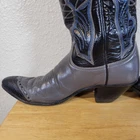 These Tony Lama women's cowboy boots are a must-have for any cowgirl! The black and gray boots feature a wingtip design and are made of high-quality leather. The boots are a size 7B and have a classic Western style, perfect for any wardrobe. The boots are a vintage model, made in the United States, and have a unique lizard tip for added flair. They are perfect for any occasion, whether you're heading to a dance or just running errands. These boots are a great addition to any collection and are sure to make a statement. In great pre-owned condition showing a little wear. Please examine pictures thoroughly for wear and condition