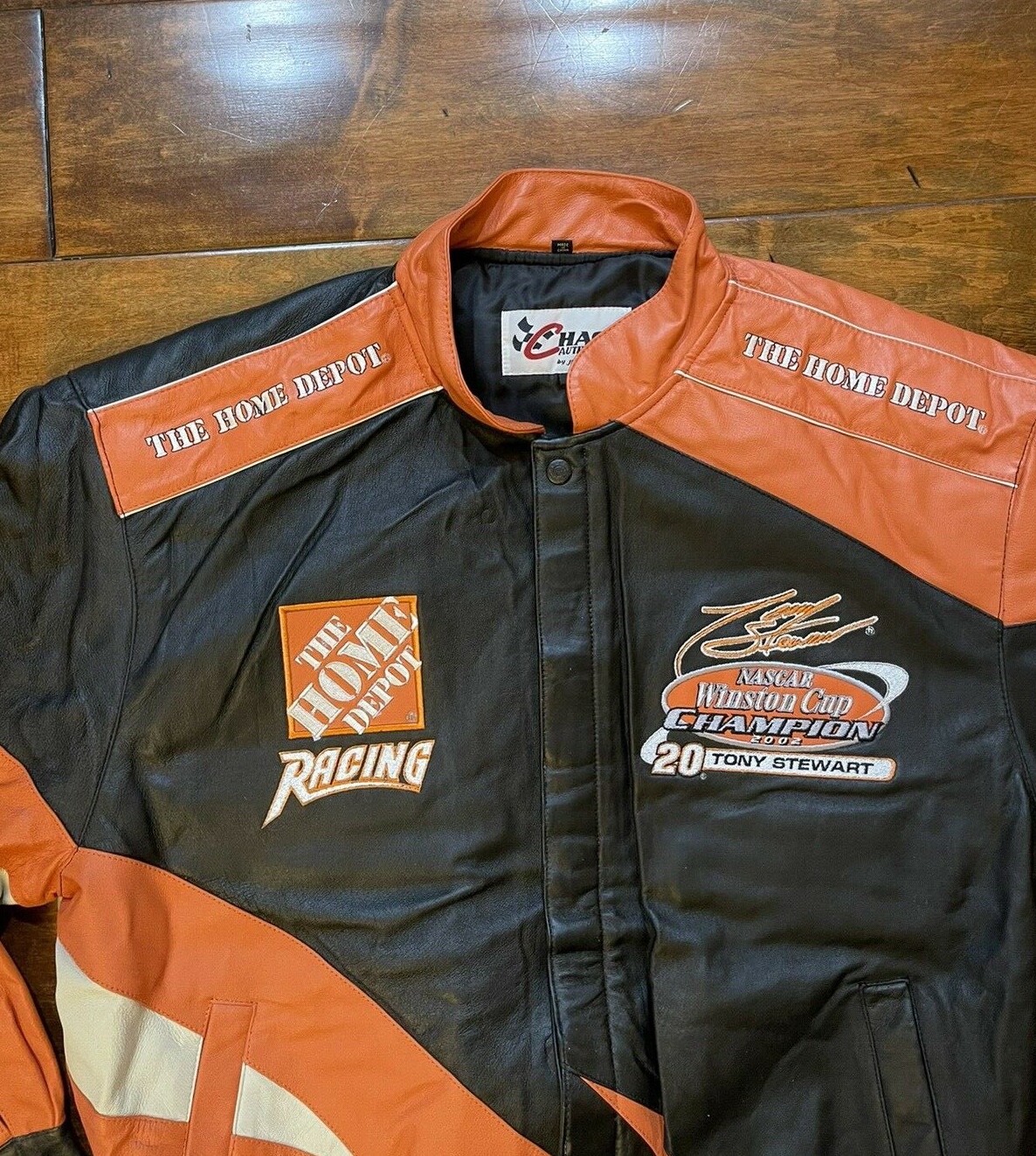Tony Stewart #20 Home Depot Racing 2002 Cup Champion Leather Race Jacket Mens Size Large NASCAR New JH Design Brand New with tags!! Condition can be seen in the photos. Actual items shown in the photos. This jacket is very very rare and hard to find in this new with tags condition. Top to Bottom: 26 in Pit to Pit: 24.5 in Shoulder to Shoulder: 22 in Sleeve (From shoulder to end of sleeve): 24 in 100% Authentic NASCAR gear!! Ships within 1 business day of payment being received!! We ship with care! Checkout my other items for sale for other NASCAR gear, clothings, hats, sports memorabilia and much much more!! Don't hesitate to ask any questions!!