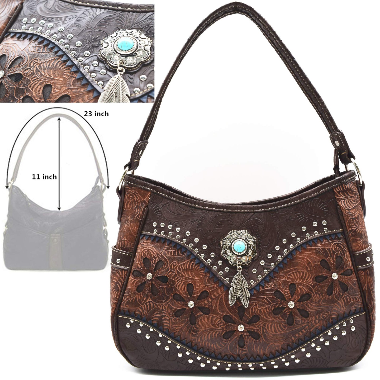 Western Cowgirl Classic Shoulder Bag With Wallet Set [Interior: Top Zipper Closure, Interior Middle Zipper, Divider Pocket with Multiple Interior Size Pockets and Flap Magnetic Closure. Exterior: Back Slot with Zipper Concealed Carry Pocket Made Of Vegan Leather - High Quality PU Leather- With a Cotton/Polyester blend lining Proudly Designed in the United States | Zip Top Closure | The inside of the bag have a zipped pocket in the middle | One Wall Zipper Inside - Two pouch pockets Inside Handbag: Back pocket with zipper closure Concealed Carry Pocket ( 9'' X 7'') | Strap length 23 inch | Drop length 11 inch | Wallet: The matching wallet with Removable Extra Strap Use: One shoulder oblique cross Handbag: Length 13'' Height 8'' Width 4.5'' | Wallet: 7.5" X 4.5" X 2"