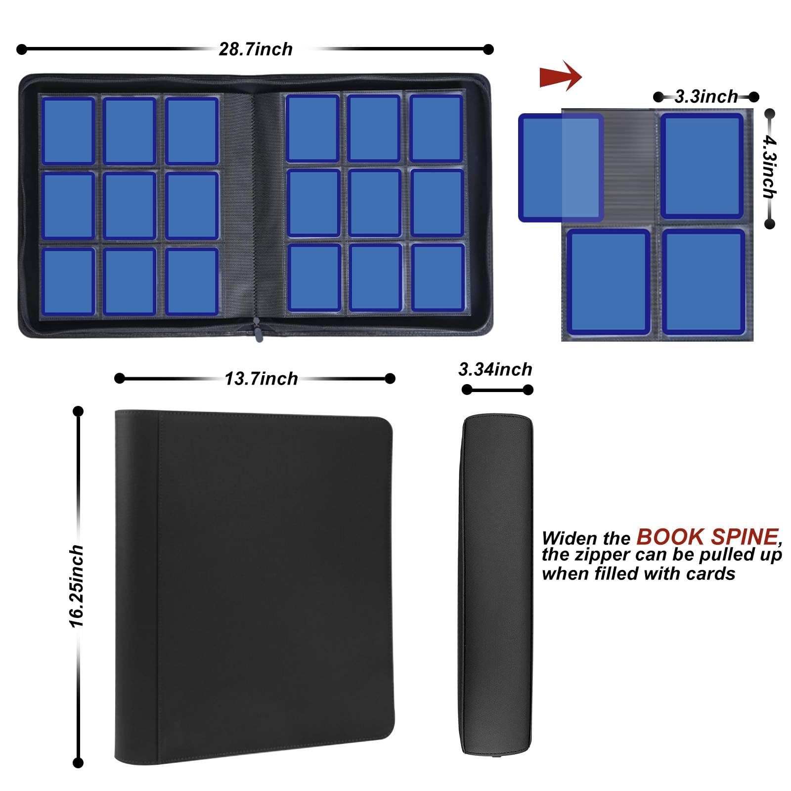 Toploader Binder Holds 9 Pocket 360 Cards,Widen The Book Spine Filled with 20 Double-Sided Pages Sleeves,Top Loader Binder for Cards Compatible with 3×4'' 35pt Rigid Pokemon/Sports Trading Cards 【Large Capacity of Top Loader Binder】9-Pocket binder with 20 pages of sleeves can hold up 360 TopLoaders,compatible with 3'' x 4'' 35pt Rigid Cards sleeves/single sleeve cards/sleeveless cards(Not Applicable to Magnetic Cards cases),holders for Pokemon Trading Cards. 【Upgraded Design】Our binder have Widen the Book spine and zipper fabric to ensure that the zipper can be closed properly when filled with cards. 【Perfect Design】The Trading card binder is made from durable and waterproof PU material for easy cleaning,card sleeves are made of clear polypropylene,Durable quality,Acid-free,Waterproof, Insert cards from the side and prevent them from falling out.Easier to wipe,which makes your case look like as always new. 【Wide Application】Our trading card holder store and display the 3'' x 4'' Cards you own, keep your TCG cards /baseball cards /basketball cards/football cards/sports cards and more cards organized,dust-free,and protected inside this case. 【AFTER-SALES SERVICE】Well-designed and lovely style appearance with Exquisite stitching and workmanship,Great for Game cards collection and storage.Feel free to message us through"contact sellers"if products don't meet your expectations.
