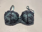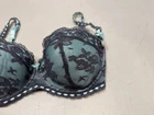 This Topshop bra is a green balconette style with an underwired construction and padded cups for added support and shaping. The bra features a floral lace covered design with embroidered accents, giving it a feminine touch. It has a bra strap closure with hook and eye fastening, suitable for a band size of 34 and cup size of DD. Perfect for women looking for a stylish and comfortable lingerie option.