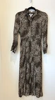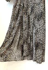 This Topshop maxi dress in size 0 features a brown animal print on jersey fabric with a round neckline, long sleeves, and a button front split design. It has a casual style with a grunge, outdoor, goth, and modern theme. The dress is lightweight, backless, and machine washable, suitable for winter, summer, fall, and spring seasons. Made of polyester, it has a casual sleeve type and a length that falls to the floor.
