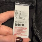 Topshop MOTO black denim mini skirt in a classic high-waist silhouette with a raw frayed hem. Made from sturdy 100% cotton denim. Easy to style with tees, sweaters, and boots. Size: Women’s US 6 (EUR 38) Color: Black washed denim Measurements (approx): • Front Waist: 14.5” • Length: 16” Flat-lay measurements taken unstretched. Compare to your own for best fit. Condition: Excellent preowned condition. No stains, holes, or excessive wear. Smoke-free home. Ships fast. topshop,moto,topshopmoto,denimskirt,blackdenim,mini skirt,rawhem,frayedhem,aesthetic,streetstyle,summerstyle,fallstyle,basics,100cotton,size6,eur38