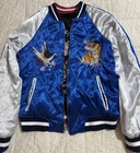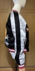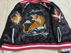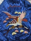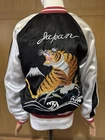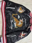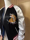 Stylish and rare Topshop reversible satin bomber jacket, inspired by traditional Japanese souvenir (Sukajan) designs. This eye-catching piece can be worn on either side, each featuring different embroidery and color combinations. Details: Side 1: Shiny blue satin body with silver sleeves and quilted front and back. Features embroidered tiger and eagle motifs on the chest. Side 2: Black body with silvery white sleeves, embroidered “Japan” text and an eagle like bird design. Classic striped ribbed collar, cuffs, and hem. Zip front closure. Beautiful glossy satin finish. Size: UK 8 Condition: Good used condition. Some pulled threads on the silvery side and a few light superficial marks on the sleeve these should lift with a professional dry clean. Structurally excellent and looks great when worn.