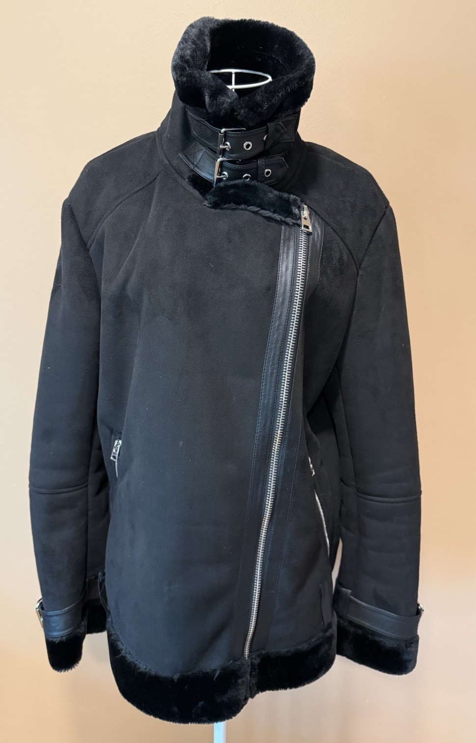 Stay warm and stylish in this Topshop Women’s Faux Suede and Faux Fur Moto Aviator Jacket, in excellent used condition with a minor stitching flaw (see photo). This cozy black faux-suede jacket features a plush faux-fur lining and collar, asymmetrical zip front, and buckle collar detail for that classic moto look with a quiet luxury twist. Fully lined and soft to the touch, it’s perfect for winter layering, city chic, or model-off-duty style. ✨ Condition Note: Minor flaw — small section of stitching on one bottom loop is coming loose (see photo). Cosmetic only; does not affect structure or wear. ⸻ 📏 Measurements (approx): • Chest: 44” • Length: 27”