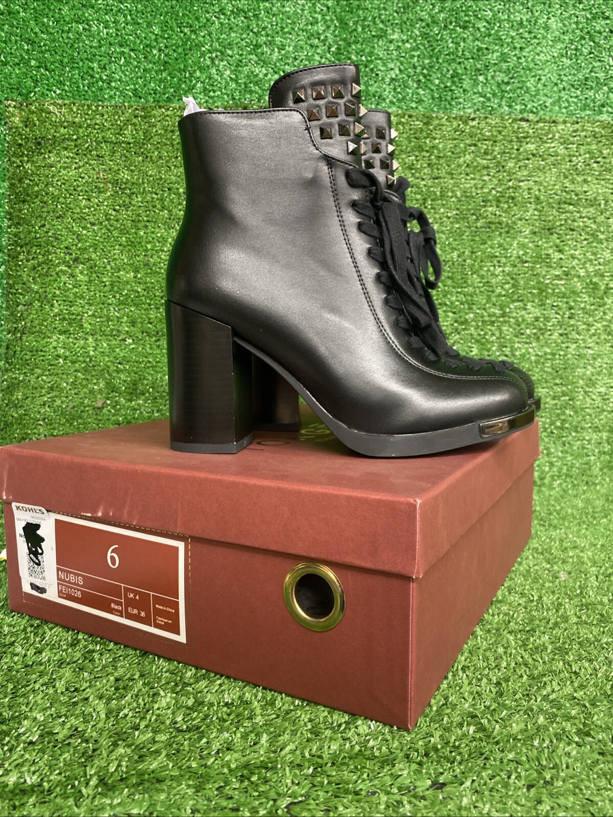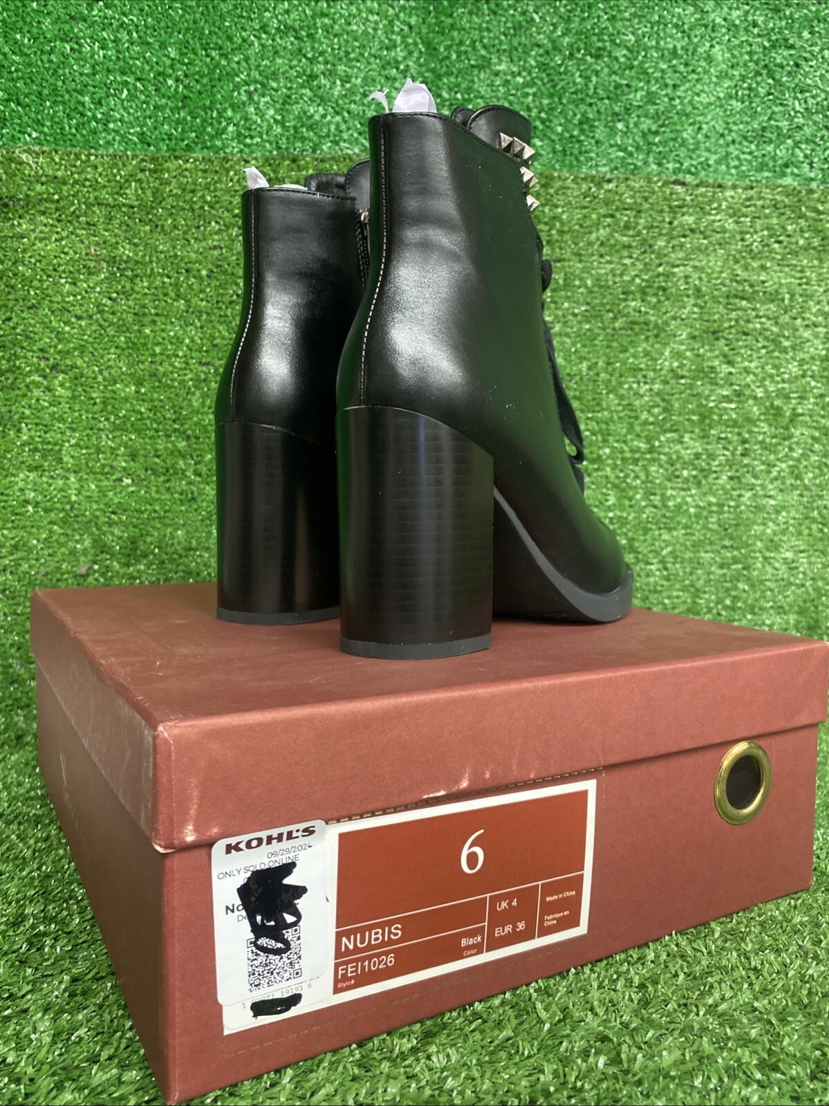 These Torgeis Nubis ankle boots are designed for women in a size 6. They feature a black leather upper with stylish studded accents, giving them a trendy and edgy look. The brand is Torgeis, and the style is a bootie, making them a fashionable choice for any outfit. SKU-e8 Date-12/17/24 Listed by- TH Item condition-new with box Shade/size- black/6