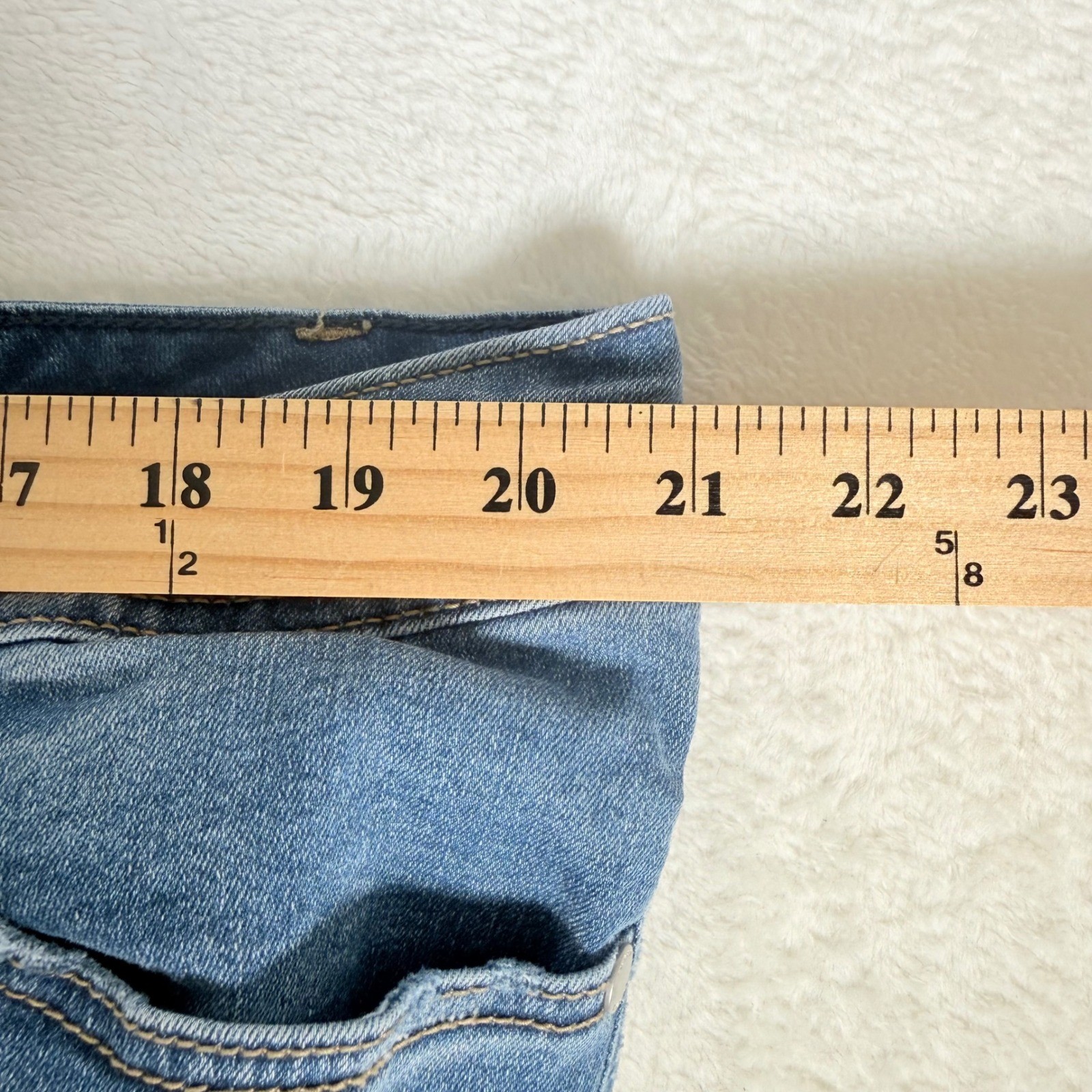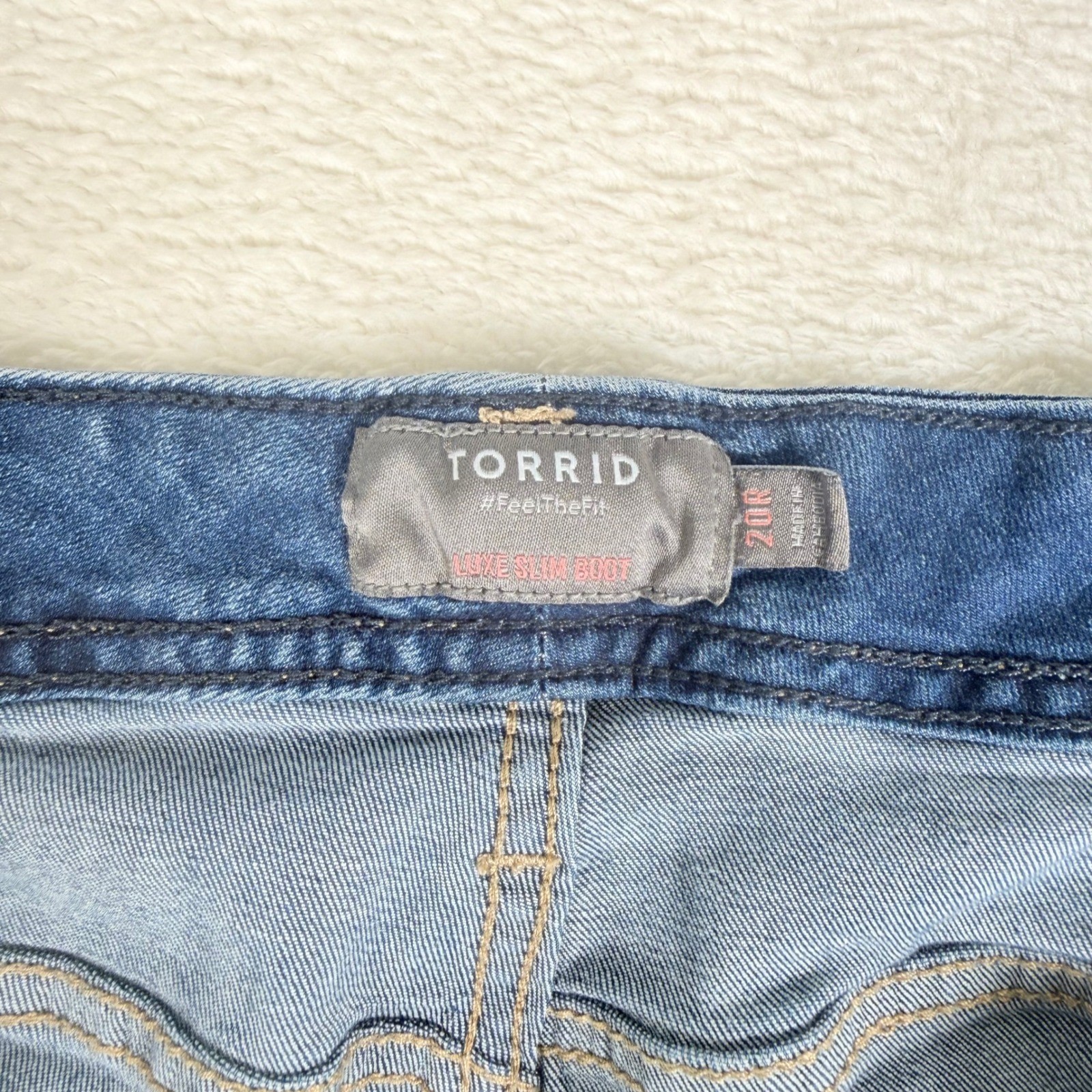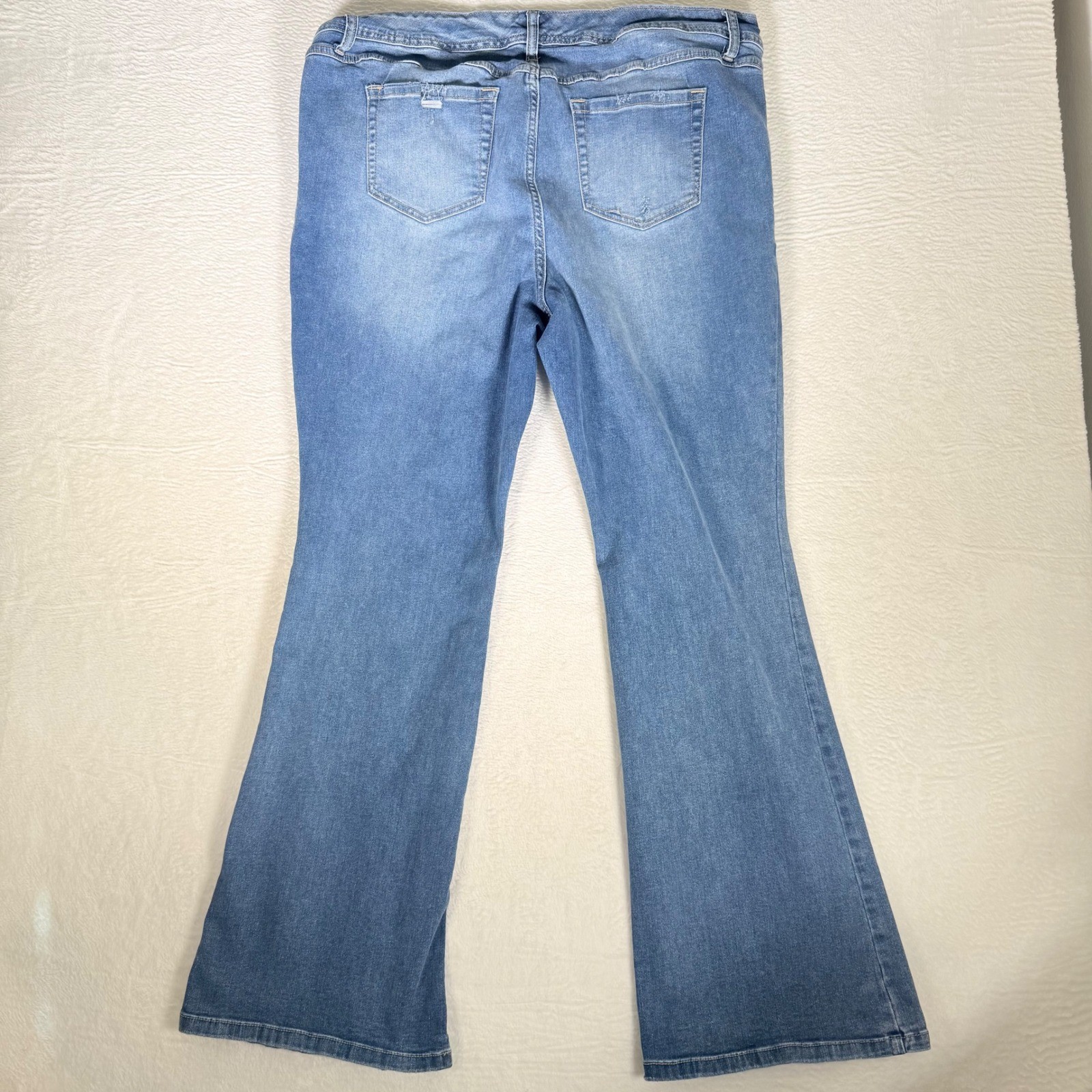 Measurements: • Waist: 42 in • Inseam: 32 in • Rise: 10.5 in Style: Bootcut Department: Women Fabric Wash: Medium Type: Jeans Features: Pockets, Distressed, Stretch Fit: Slim Pattern: Solid Rise: Mid (8.5-10.5 in) Fabric Type: Denim Material: Cotton Blend, Polyester, Spandex Closure: Button Season: Spring, Summer, Fall, Winter Keywords: Torrid jeans, women's denim, flare jeans, bootcut pants, light wash denim, plus size fashion, casual wear, everyday style, comfortable jeans, trendy denim, distressed details