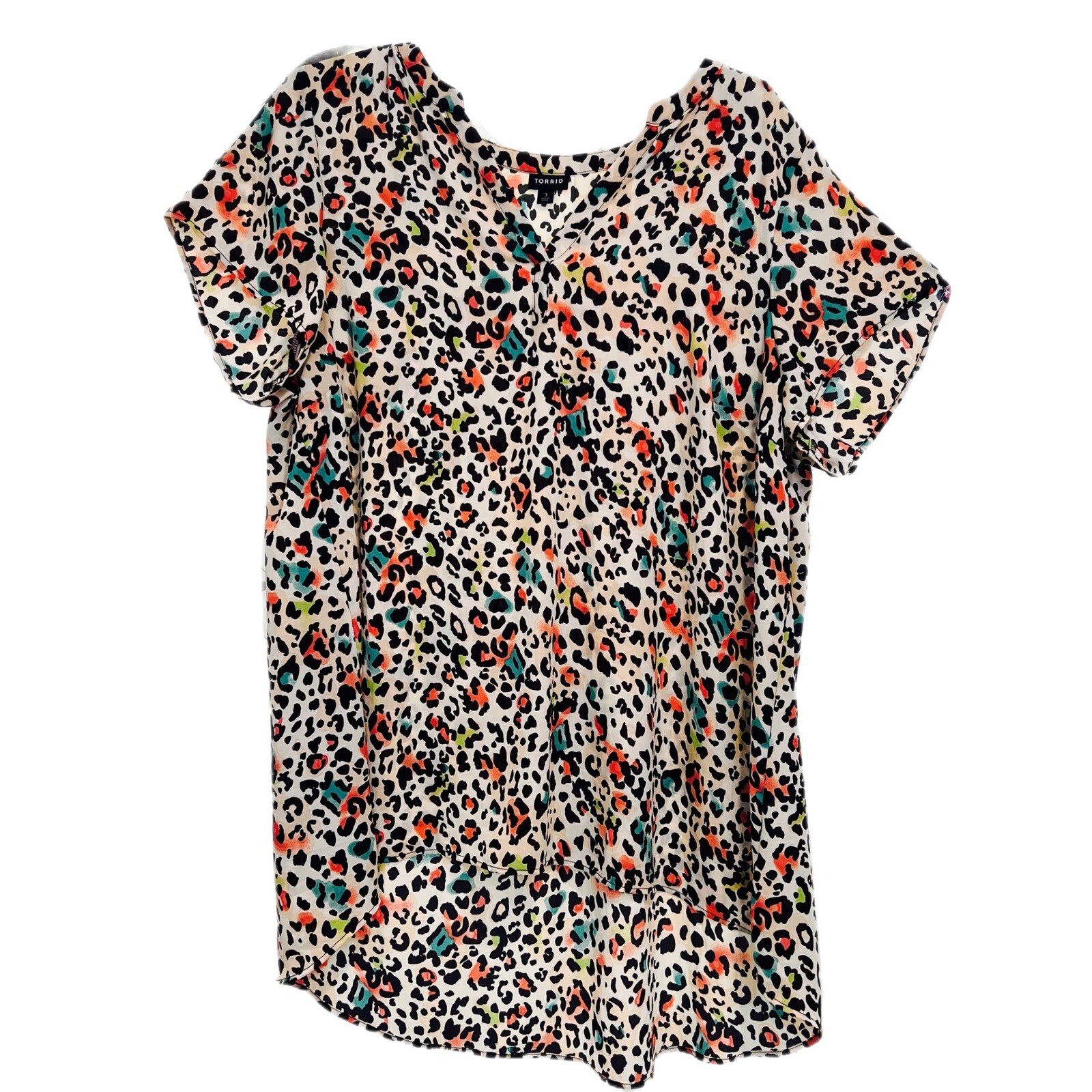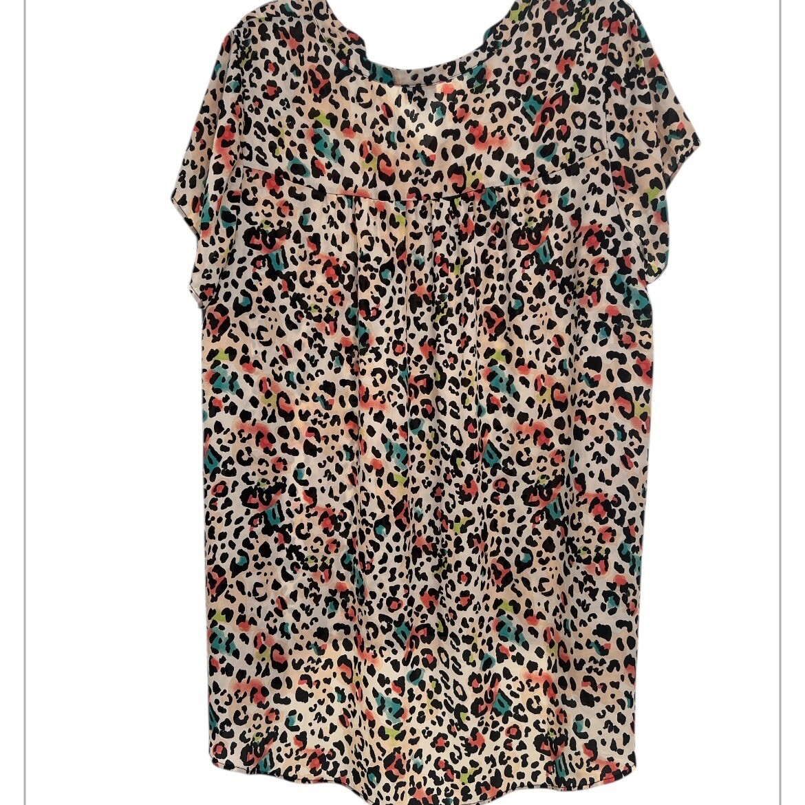 Torrid | Leopard Watercolor Georgette Pullover Hi-Lo Flowy Tunic Blouse Size 3X Make a bold statement with this Torrid Leopard Watercolor Georgette Pullover Hi-Lo Tunic Blouse in Size 3X. Featuring a flowy fit, v-neckline, and vibrant animal print, this blouse is perfect for casual days, brunch, or the office with leggings or jeans. Approximate Measurements Chest Width: 23.0 in. Shoulder Width: 18.0 in. Body Length: 32.0 in. Back Length: 37.0 in. Sleeve Length: 7.5 in. Bottom Hem Width: 30.0 in. Excellent used condition, no stains, no holes leopard print hi-lo tunic georgette blouse flowy top plus size pullover blouse animal print casual chic office wear Torrid top