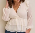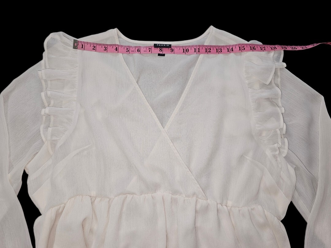 Torrid Off White Sheer Long Ballon Sleeve V-Neck Ruffle Top Blouse Women's Size 1X Clean New Without Tags Condition. (Item has been washed) (FREE SHIPPING) (Please see photos for measurements) Please be sure to double-check your own measurements before ordering. Feel free to ask any questions you may have. Take a look at our other items. Our inventory grows daily.