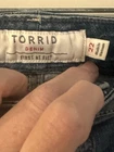 These Torrid denim button fly shorts in size 22 offer a casual and comfortable option for warm weather days. Made from a cotton blend denim fabric, they feature a high-rise waist and regular fit for a flattering silhouette. The solid blue color and American theme make them versatile for various occasions, from walking to the beach. With a flat front and cut-off style, these shorts are perfect for a laid-back yet stylish look. Preowned Good Condition