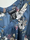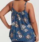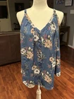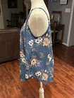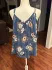 This Torrid Georgette Button-Front Tunic Cami is a blue floral cami with a button front and V-neck. It features a sleeveless design with spaghetti straps and is made of lightweight georgette, rayon fabric. The camisole has a bohemian and classic style, making it a perfect choice for summer and spring. Easy to care for with machine washable instructions, this top offers an adjustable strap for a comfortable fit. Condition: Pre-owned. Coming from smoke free home. Details: Size 00 M/L 10 Georgette fabric V-neck; V-back Sleeveless; adjustable straps Front button closure Shirttail hem