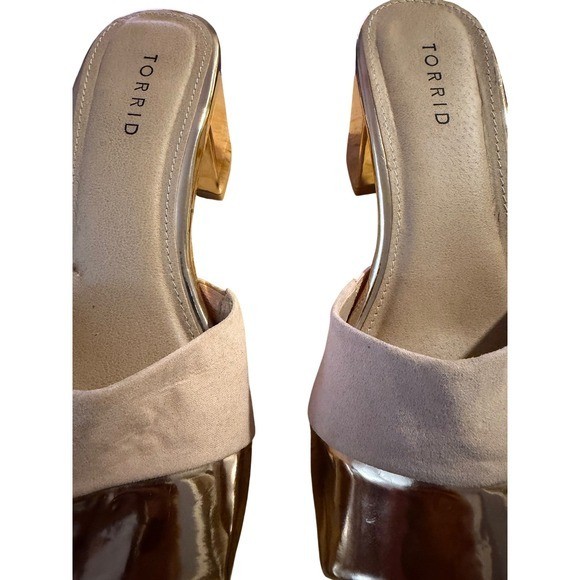 Step into glamorous sophistication with these Torrid block heel slide mules. The stunning metallic gold platform gorgeously contrasts with the soft blush suede strap, creating a dazzling effect that will turn heads. Designed for both comfort and style, these mules feature a substantial block heel that elongates your silhouette while providing stability for all-day wear. Perfect for elevating your look at a summer wedding, a stylish evening out, or a chic brunch. Style: Mule Department: Women Upper Material: Suede, Polyurethane UK Shoe Size: 9.5 AU Shoe Size: 11 Heel Style: Block Type: Heel Theme: Going Out, Metal Toe Shape: Open Toe Pattern: Solid Heel Height: Mid (2-2.9 in) Closure: Slip On Features: Comfort, Cushioned Insole Material: Fabric Outsole Material: Rubber Keywords: Torrid shoes, gold heels, suede mules, block heel, slide sandals, metallic shoes, wide width, dressy sandals, evening shoes, party heels, summer fashion, glamorous footwear ✨ Living the Brooklyn Dream ✨ Your one-stop shop for timeless style — men's, women's, shoes, and beauty finds, both new and preloved. Follow us for more curated looks and exclusive drops!