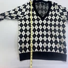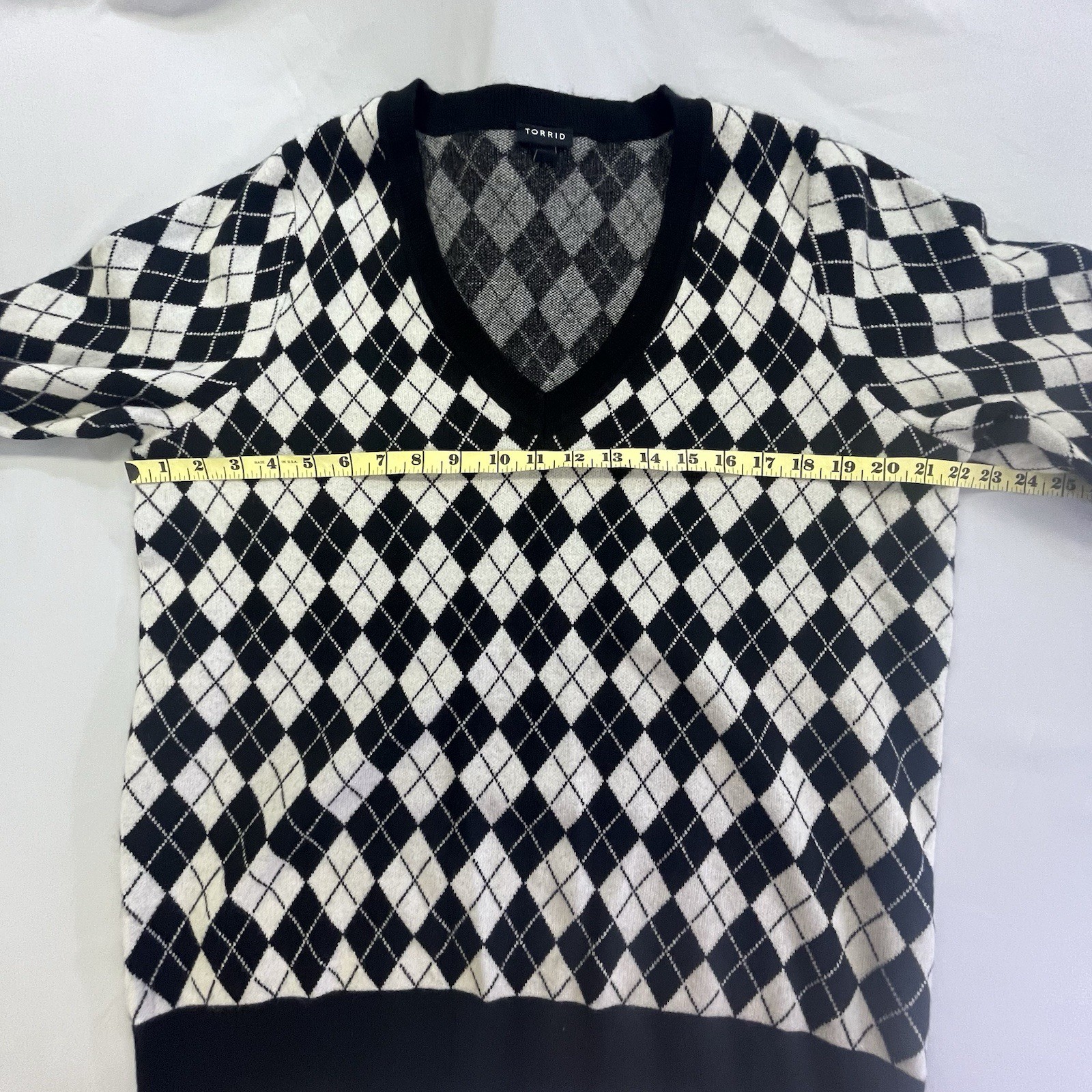 The Torrid Women's Long Sleeve Argyle V-Neck Pullover Black & White Sweater in size 1X is a stylish and comfortable addition to any woman's wardrobe. This tight-knit sweater features a classic argyle/diamond pattern in black and white, perfect for casual or workwear occasions in the fall and winter seasons. The relaxed fit and raglan sleeves provide everyday softness and a touch of preppy style. Machine washable and made of a blend of polyester, nylon, and rayon, this pullover sweater from Torrid is a versatile and practical choice for the modern woman. Measurements are flat lay Torrid Sz 1 = 1X 14-16