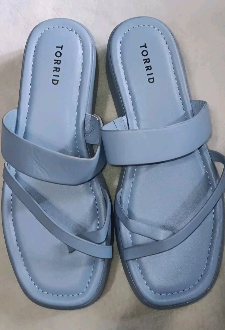 The product is a pair of Torrid women's sandals in size 11 wide, designed for comfort and style. The sandals feature a strappy design in a vibrant blue color, with a man-made upper material for durability. These sandals are perfect for women looking for a comfortable and fashionable footwear option that offers both style and practicality.