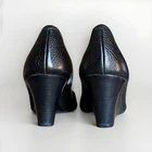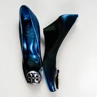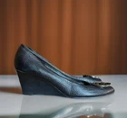 The Tory Burch Black Tumbled Leather Sally 2 Wedge Pump in size 9.5M is a stylish and comfortable heel perfect for various occasions including parties, casual wear, and business events. Featuring a peep toe design with the iconic silver Tory Burch logo, these pumps are made of high-quality leather and have a cushioned insole for added comfort. The wedge heel adds a touch of elegance, while the slip-on closure makes them easy to wear. These versatile shoes are ideal for the summer, fall, and spring seasons, adding a touch of sophistication to any outfit.