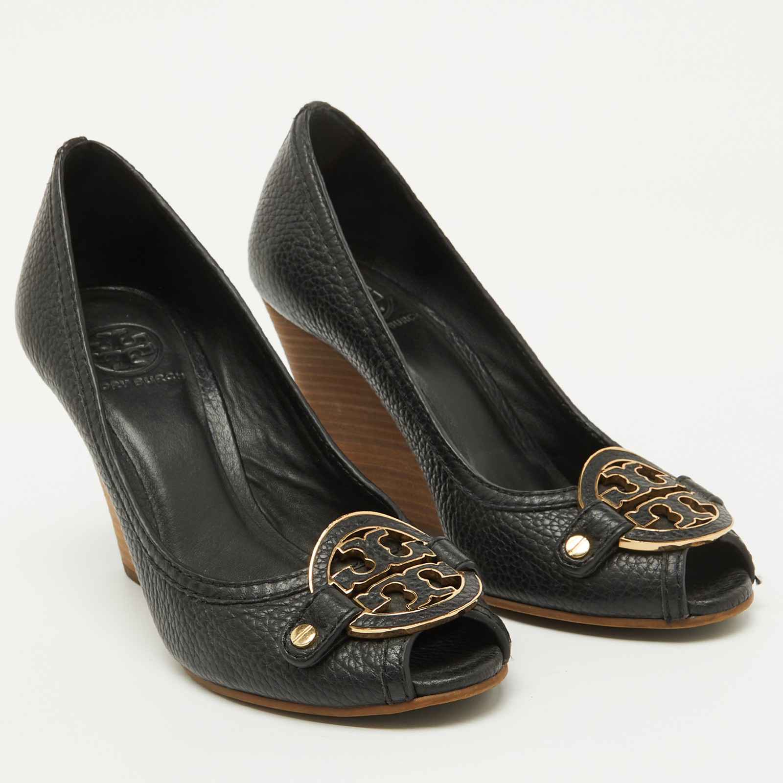 These Tory Burch pumps are a perfect blend of style and practicality, featuring black leather with a peep toe design. The iconic Tory Burch logo embellishes the front, adding a touch of sophistication. With a comfortable wedge heel, they’re ideal for both office wear and casual outings.Certified by The Luxury Closet - This item has gone through a detailed authentication process overseen by our experts. We offer a lifetime guarantee of authenticity on all our items. Import duties, taxes and charges are not included in the item price. These charges are the buyers responsibility. Please check with your country’s customs office to determine what these additional cost will be prior to buying. Our eBay Store About Us Contact Us Add to Favorite Sellers Tory Burch Black Leather Logo Peep Toe Wedge Pumps Size 38 $166.1 These Tory Burch pumps are a perfect blend of style and practicality, featuring black leather with a peep toe design. The iconic Tory Burch logo embellishes the front, adding a touch of sophistication. With a comfortable wedge heel, they’re ideal for both office wear and casual outings. Product Details Brand Color Black Dimensions Material Leather Size 38 Outsole Width 8 cm Outsole Length 24 cm Heel Height 10 cm Includes The Luxury Closet Packaging Certified by The Luxury Closet This item has gone through a detailed authentication process overseen by our experts. We offer a lifetime guarantee of authenticity on all our items. How We Check The in-house team of experts at The Luxury Closet is highly trained to verify the authenticity and the condition of the luxury products. They ensure that only 100% authentic items are put on sale.The evaluation process is unique with its own mix of assessment criteria and differs according to the category. Each item is evaluated based on the following combination of hallmarks, hardware, stitching, symmetry, material, craftsmanship, stamping, codes, hologram stickers, and packaging. Our authenticators also check if the items have been modified or amended (e.g., aftermarket diamonds, replaced batteries, repaired bags, etc.) International Buyers Import duties, taxes and charges are not included in the item price. These charges are the buyers responsibility. Please check with your country’s customs office to determine what these additional cost will be prior to buying.