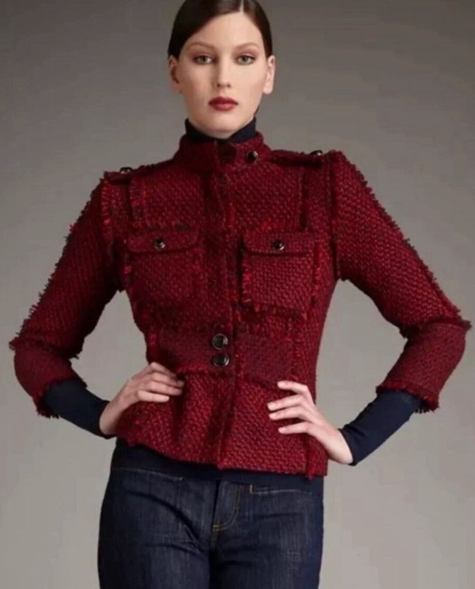 This is a Tory Burch Kington Tweed Jacket in size 8 for women. The jacket features a red tweed outer shell with button and snap closures, lined with polyester and equipped with pockets. It is designed for travel and business and has a preppy style, suitable for winter, fall, and spring seasons. The jacket also includes accents like the Tory Burch logo and a plaid pattern, making it a stylish mid-length outerwear option. 1 small buttons from the collar is missing . It doesn’t affect the overall look of the jacket