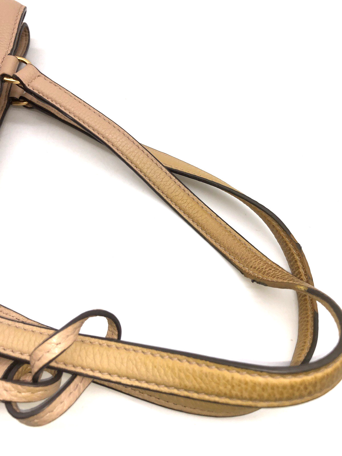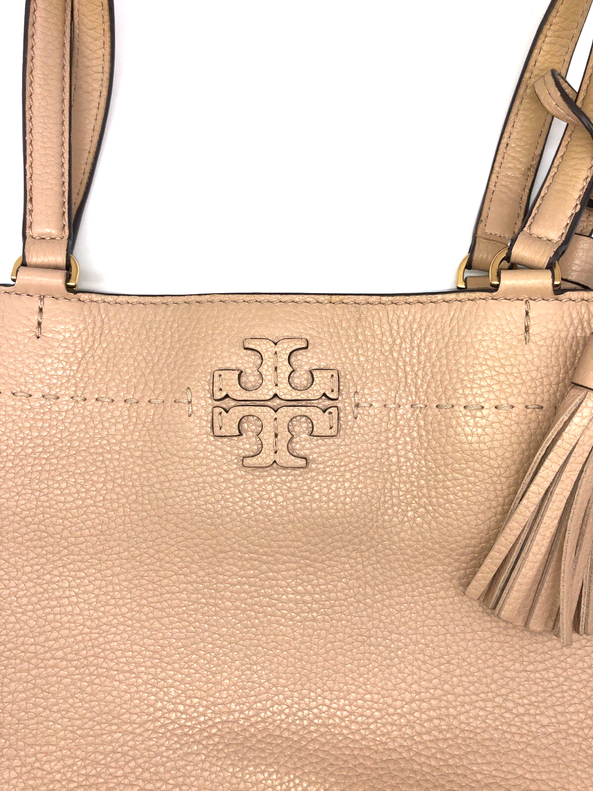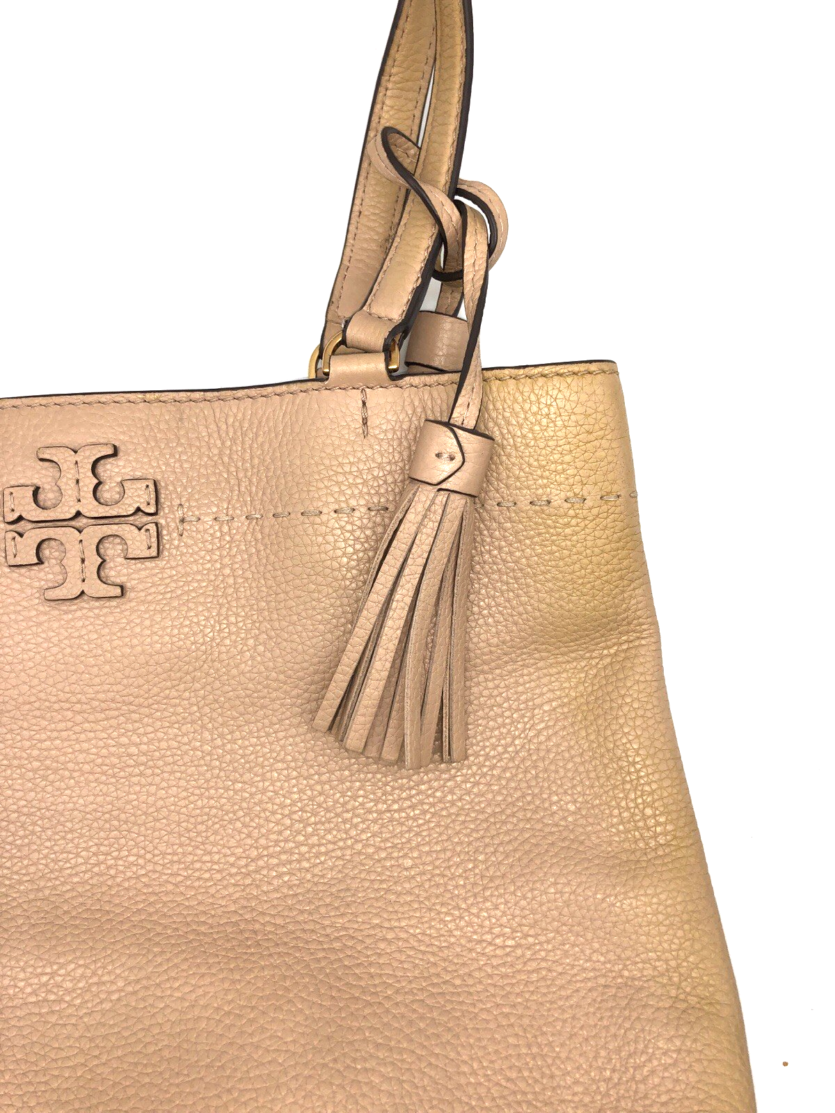 The Tory Burch McGraw Tote in Beige Taupe is a stylish and spacious shoulder bag that features a tassel accent, perfect for adding a touch of sophistication to any outfit. The large size makes it ideal for carrying all your essentials, while the hook and loop closure ensures your belongings are secure. Crafted from leather with brass hardware, this tote exudes quality and elegance. The interior organizes your items with a beige leather lining and a bag charm for added flair. The combination of solid pattern, gold hardware accents, and tassel detailing make this Tory Burch tote a must-have for fashion-forward women. Please see photos for condition, item has yellow discoloration on right side as well as handles, may need professional cleaning. Thank you & feel free to ask any questions.