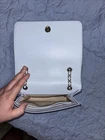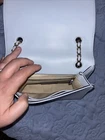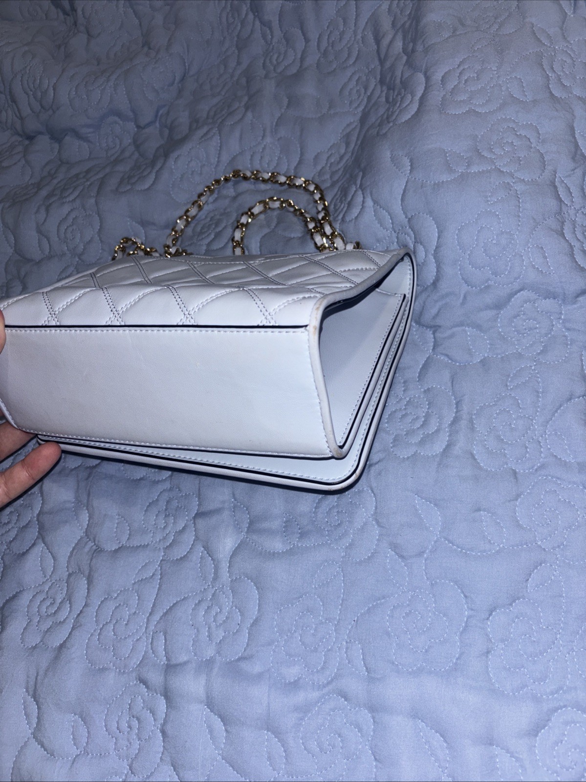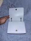 The Tory Burch Quilted Leather Shoulder Bag with Chain Strap is a stylish and versatile accessory for women. Made with high-quality leather in a beautiful blue exterior color, this medium-sized bag features a magnetic closure and a detachable gold chain strap for added convenience. The quilted finish and gold hardware give it a touch of luxury, while the shoulder strap design makes it easy to carry on the go. Perfect for any outfit, this designer bag from Tory Burch is a perfect blend of fashion and functionality.Have few stains but besides that great condition like new!