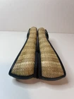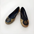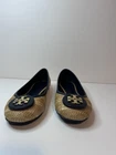 This is a pair of Tory Burch Reva ballet flats in size 8M. The shoes feature a round toe shape and a slip-on closure, with a blue leather upper accented with raffia detailing. They are lined with leather, cushioned, lightweight, and have a non-slip rubber outsole. The design includes the Tory Burch logo accents and a royal metal theme, making them suitable for various occasions such as travel, parties, work, and casual wear during the summer, fall, and spring seasons. Size 8 Blue Excellent condition Fits like size 8.5 M