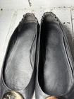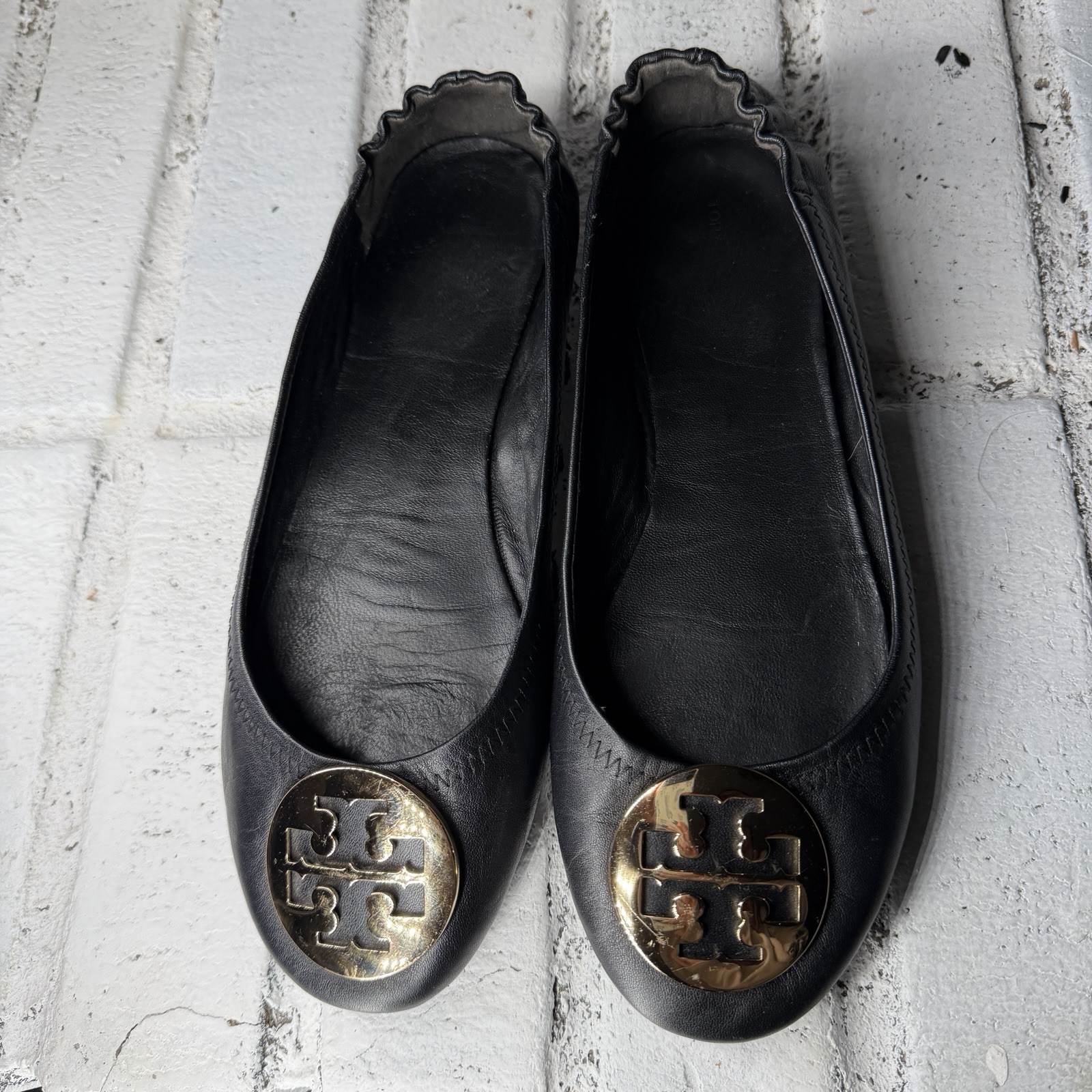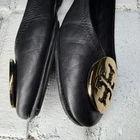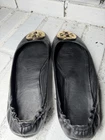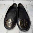 Good condition Tory Burch Women's Minnie Travel Ballet Flats 50393-013 Perfect Black/Gold. Women’s size 10M. MSRP: $225 Leather upper, leather lining, and rubber outsole. Golf metal Tory Burch medallion logo. There are some minor scuffs but overall shoes are in good, clean condition.
