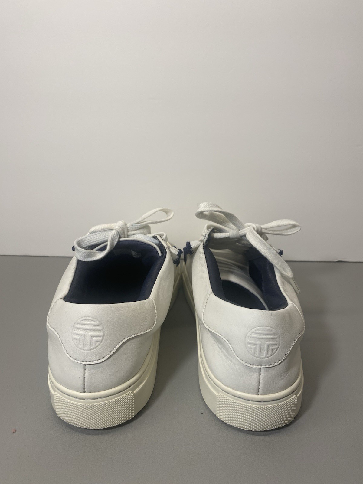 Tory Burch Sport Ruffle Sneakers 8.5 White Navy Calf Leather Lace Up Womens. Pre owned condition.