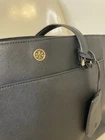 The Tory Burch Women's Parker Tote Bag in Black Leather is a stylish and practical accessory for any woman on the go. With dual handles and a sturdy zipper closure, this small tote bag is perfect for carrying your essentials in style. The exterior is made of luxurious leather with a solid black color and a subtle zipper accent, while the interior features a brown lining and an outer pocket for added functionality. Perfect for everyday use, the Parker Tote Bag combines fashion and functionality seamlessly. Two strap holders are damages but could easily be repaired. Willing to accommodate repairs for a fee if interested - just message us!
